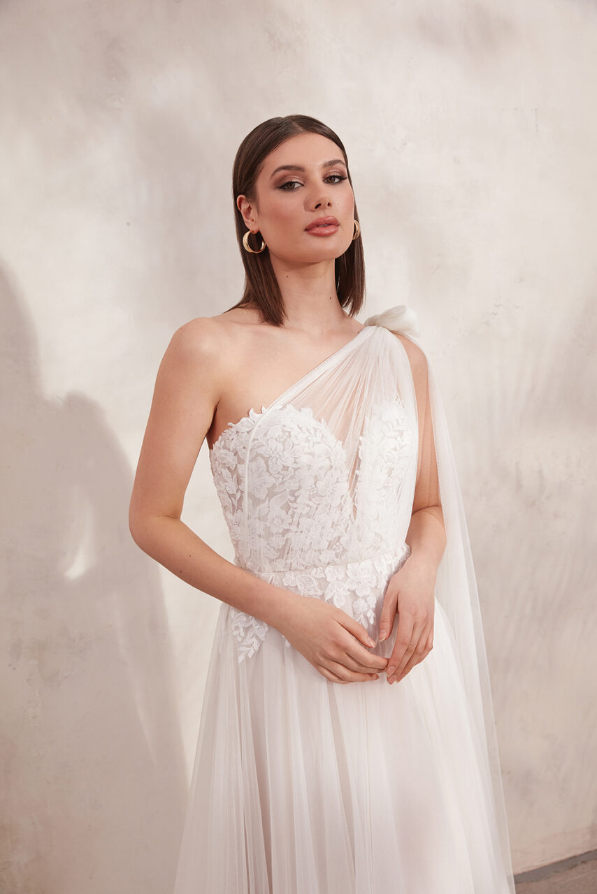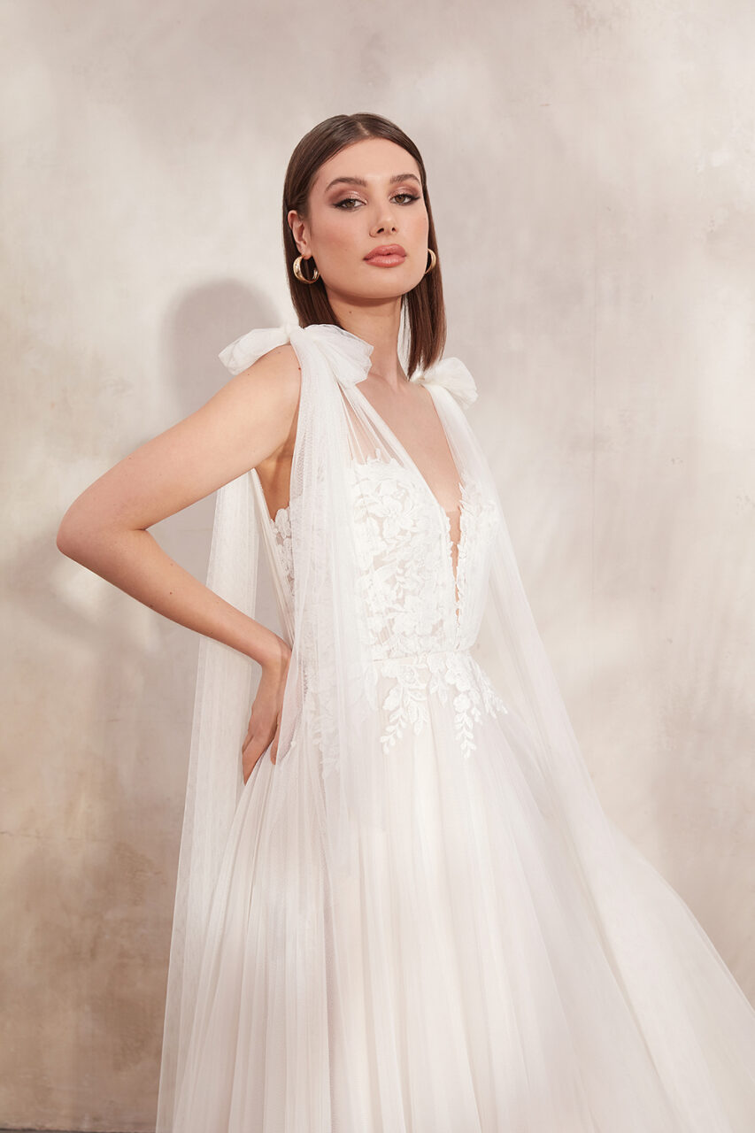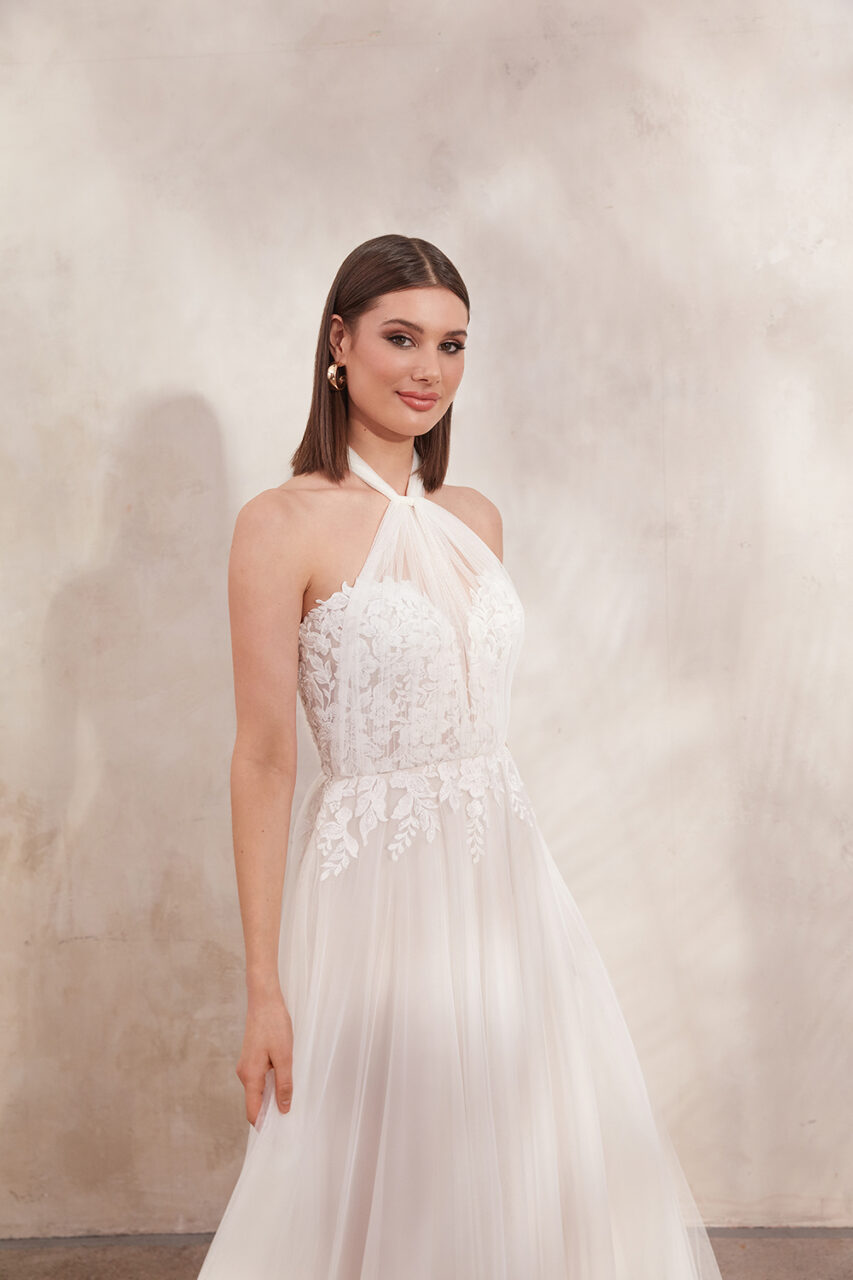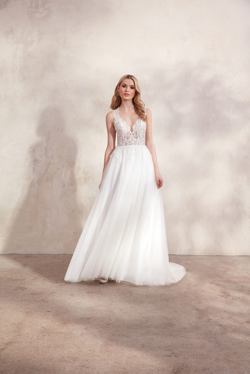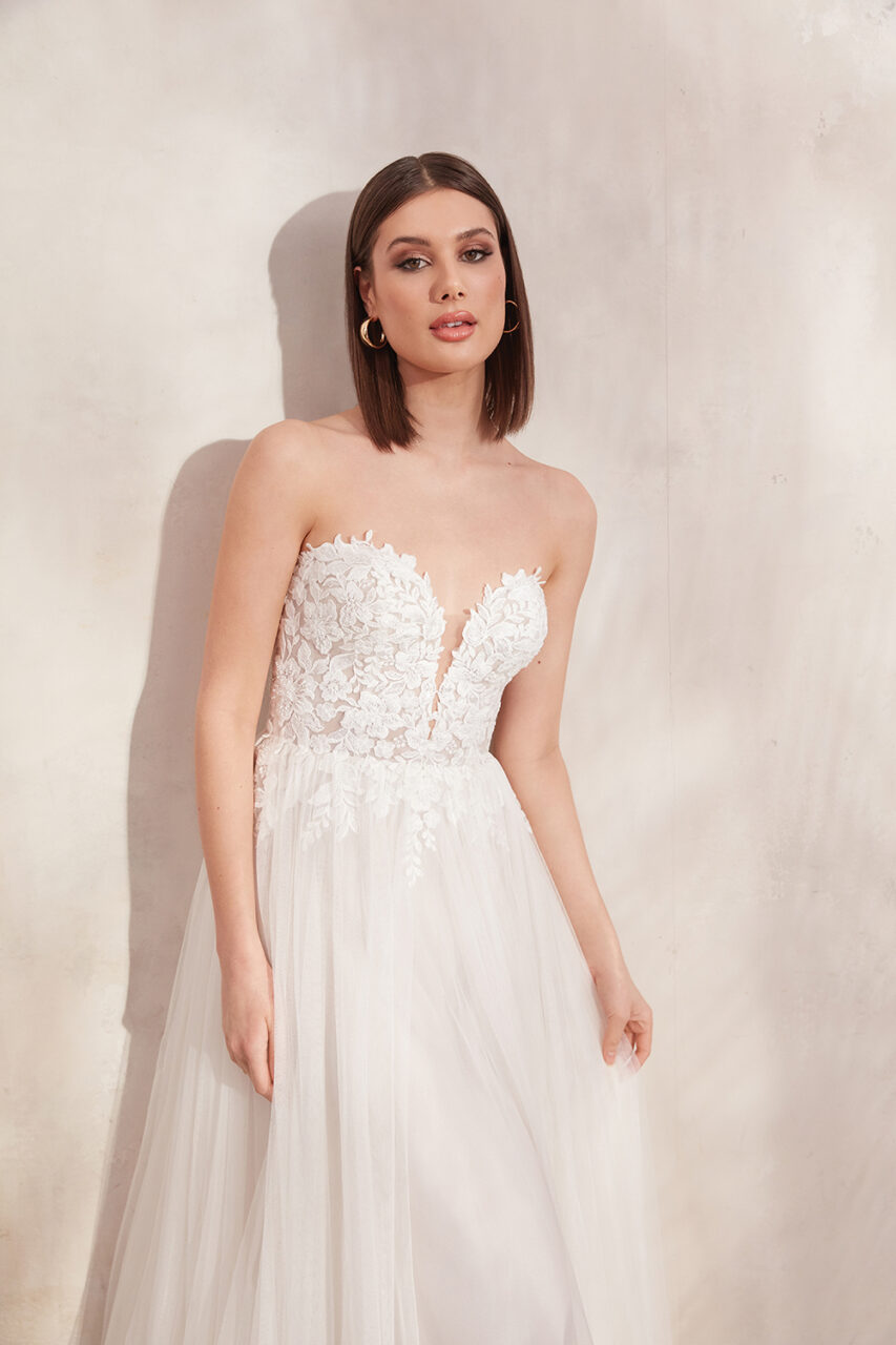 Oralee hat einen trendigen tiefen Bikini-Ausschnitt, der mit einer Gitternaht und einer komplizierten, tonalen Perlenverzierung versehen ist. Die mit Perlen besetzten Spaghettiträger fangen das Licht wunderschön ein und führen zu einem V-Rücken. Der traumhafte A-Linien-Rock aus Glitzertüll umschmeichelt jede Körperform und sorgt mit seiner schwungvollen Schleppe für eine gute Bewegungsfreiheit.