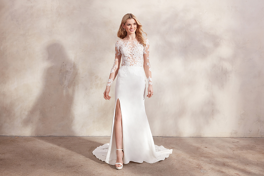 Für ein Hochzeitskleid, das zurückhaltend und doch gewagt ist, hat dieses figurbetonte Hochzeitskleid alles, was es braucht. Mit einem gewagten Illusionsmieder und langen Ärmeln sind grafische, florale Spitzenapplikationen auf dem durchsichtigen Tüll und dem sauberen Rock angebracht. Der üppige Rock aus Stretch-Crêpe betont jede Kurve und wird durch einen sexy Schlitz unterstrichen. Verdeckte Knöpfe fallen am Rücken herab und lenken den Blick auf eine atemberaubende, kapellenlange Schleppe mit Applikationen.