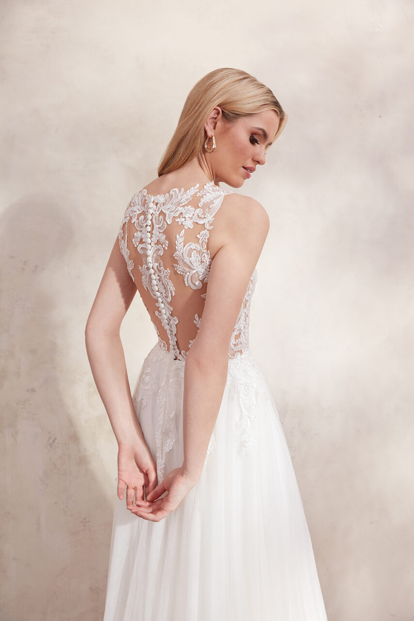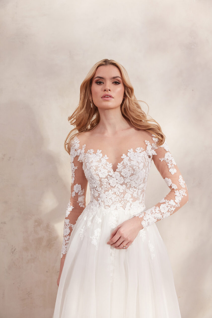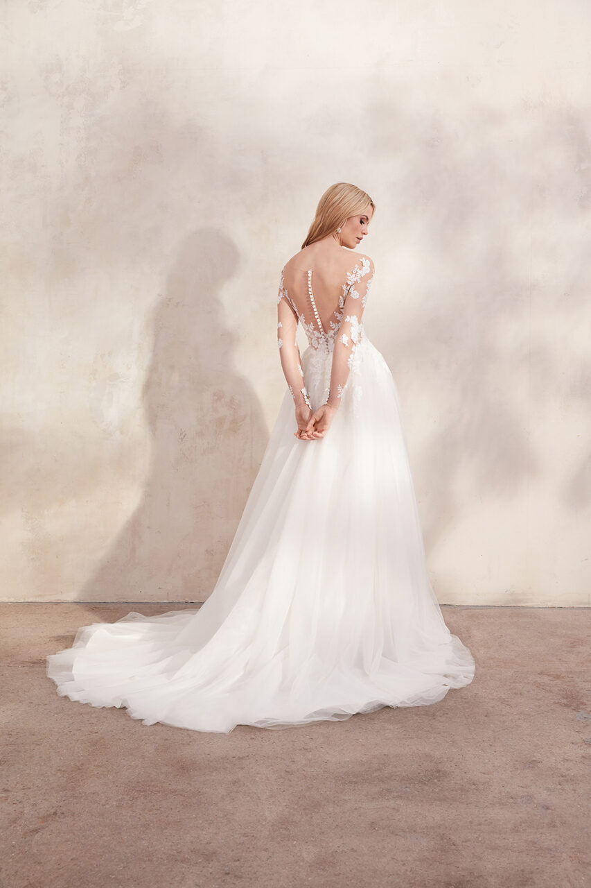 Clarabella verfügt über einen modernen Illusions-Sabrina-Ausschnitt und lange Ärmel. Leicht mit Perlen und Pailletten besetzte Spitzenapplikationen setzen ein Statement, wenn sie sanft entlang des Mieders und auf den fließenden Tüllrock rieseln. Der atemberaubende Illusionsrücken ist mit verdeckten Knöpfen abgesetzt, die bis zur Taille reichen, und eine schaumige, kapellenlange Schleppe rundet den Look ab.