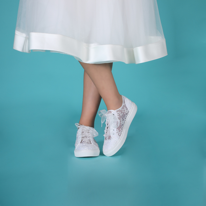 „Wir haben auch einfache, klassische Designs für diejenigen, die einen cleaneren Look bevorzugen. Es gibt Brautturnschuhe, Flats und Heels in einer breiten Palette von Höhen und Absatzformen zur Auswahl. Zu den meisten Designs gibt es auch die Option einer passenden Handtasche.“