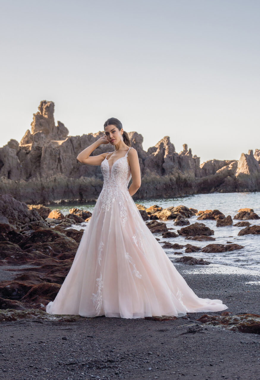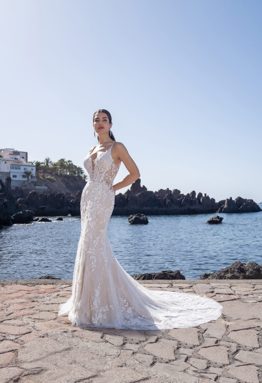 Insgesamt haben wir in der 2023 Kollektion wieder mehr voluminösere Roben designt, da der Trend zu opulenteren Modellen geht. Lange Schleppen und feine Spitzen runden den royalen Look ab. Unsere Fit’n’Flair Modelle bestechen auf der anderen Seite durch aufregende Cutouts und raffinierte Transparenzen und Rückenansichten.