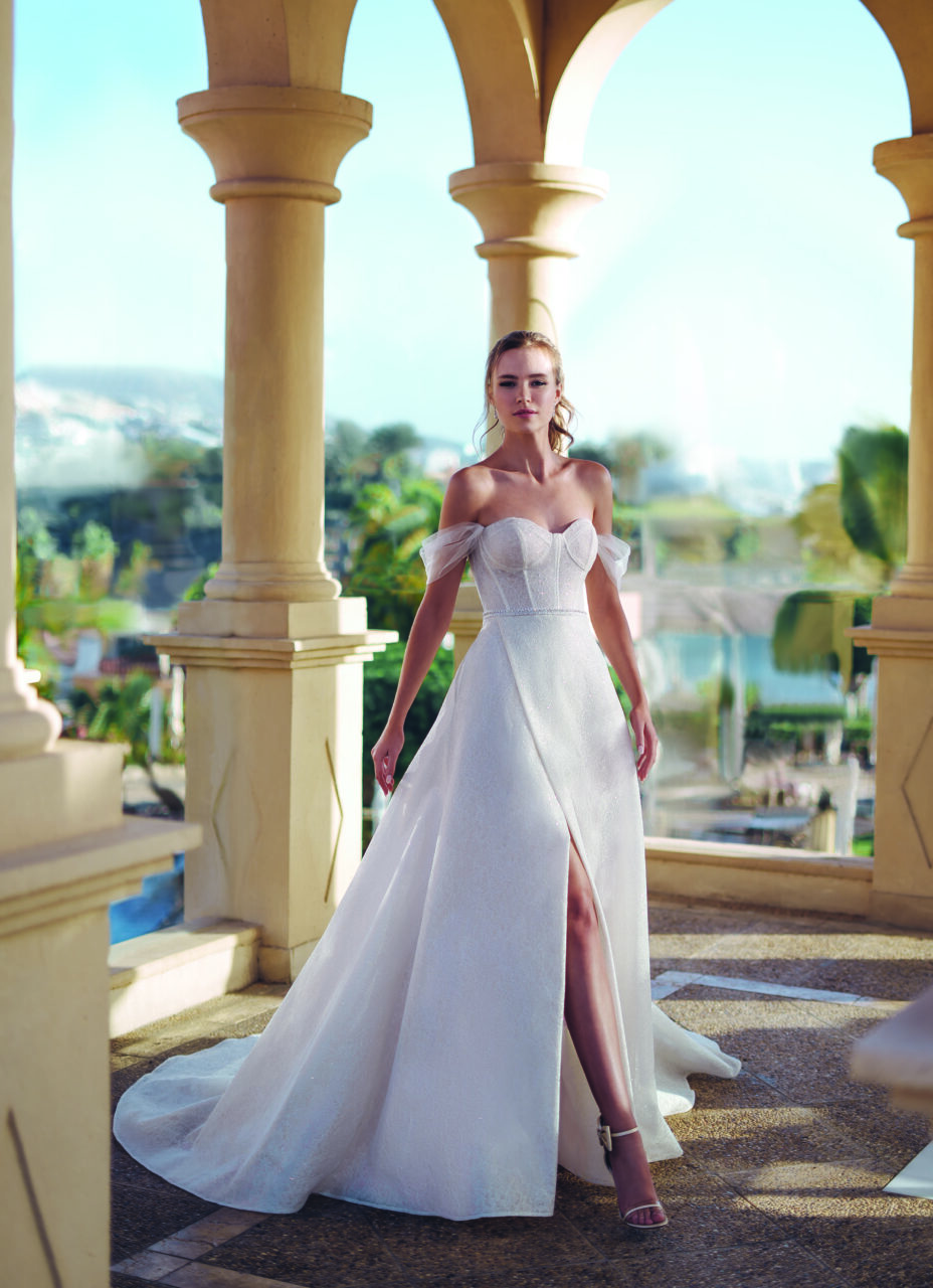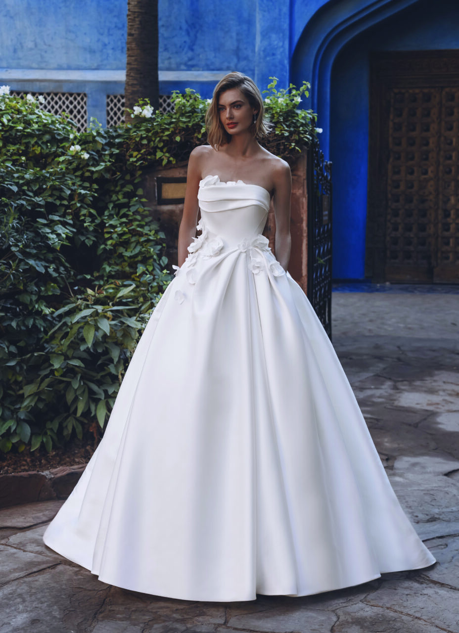 Die Kollektion ÉLYSÉE 2025 ist ein atemberaubendes Ensemble aus schick drapierten Miederteilen, geschwungenen Dekolletés und schmeichelhaften Rückenkorsetts, wobei jedes Design neue Überraschungen bereithält. Luxuriöse Stoffe wie geschmeidiger Mikado und Stretch-Georgette betonen die natürliche Schönheit der Braut, während einzigartige Spitzen und glitzernde Details für Verführung sorgen. Für einen vielseitigen Touch bieten einige Modelle abnehmbare Ärmel und Kleider, die perfekt für märchenhafte Momente sind.