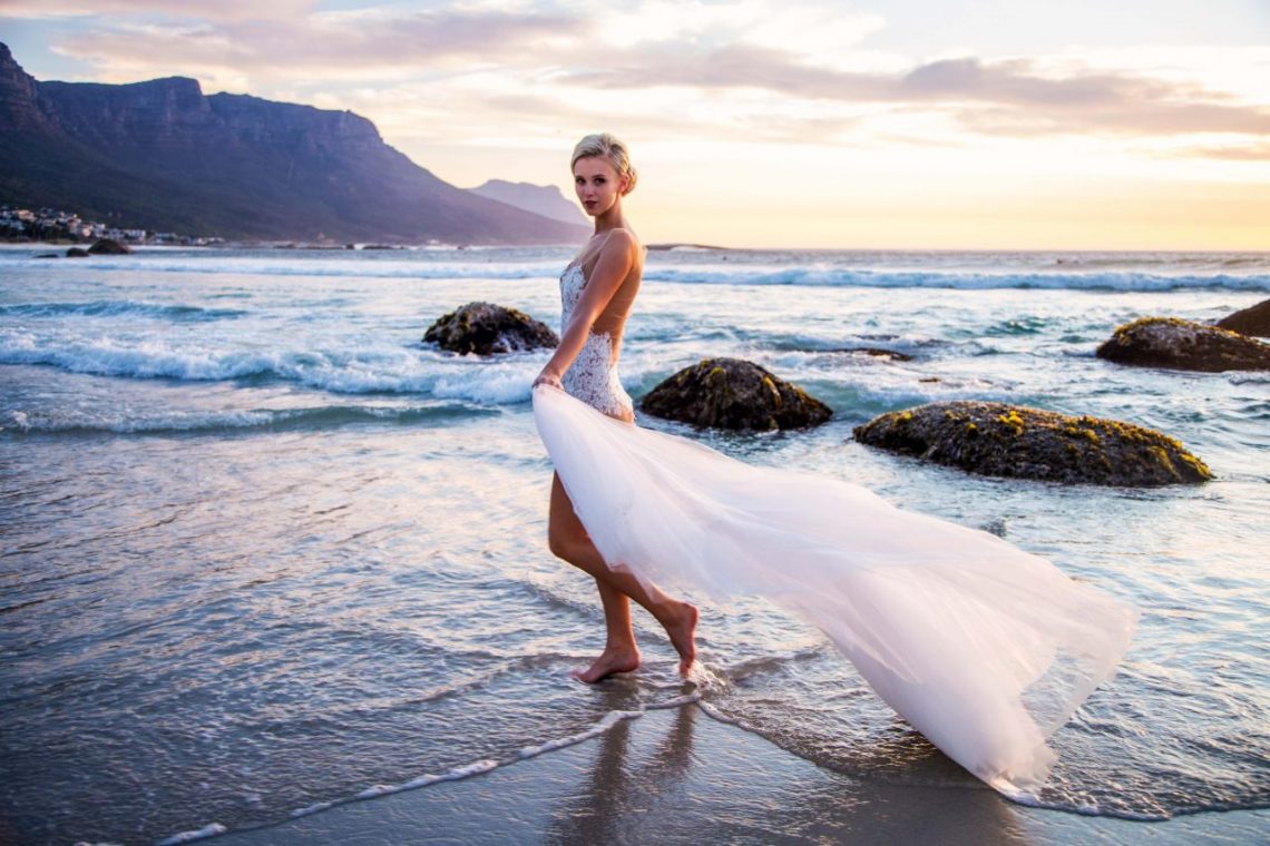 Für die perfekte Beach Hochzeit ist „weniger Stoff in dem Fall mehr! Mehr Bein zeigen, diese Transluzenz wenn die Sonne auf die Haut fällt sieht wunderschön aus. Auch leichte Seiden-Schleppen, die den Po ein bisschen verdecken und durch die die Sonne strahlt sind wunderschön. Dann fängt die Schleppe durch den Wind an zu tanzen.“ Eine Seiden-Schleppe ist jedoch sehr empfindlich und kann daher meistens nur das eine Mal getragen werden. „Eine nachhaltigere Variante ist eine Schleppe aus Viskose, diese ist waschbar und man kann sie auch noch zu einem coolen Festival-Look stylen.“, weiß Designer Emanuel.