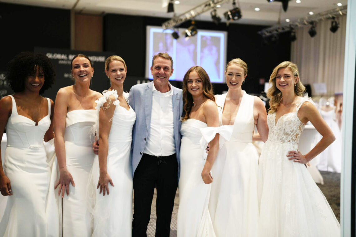 Foto: Dick van Zutphen, Inhaber und Geschäftsführer von Modeca Bridal, mit Models, die die neue Kollektion präsentieren.