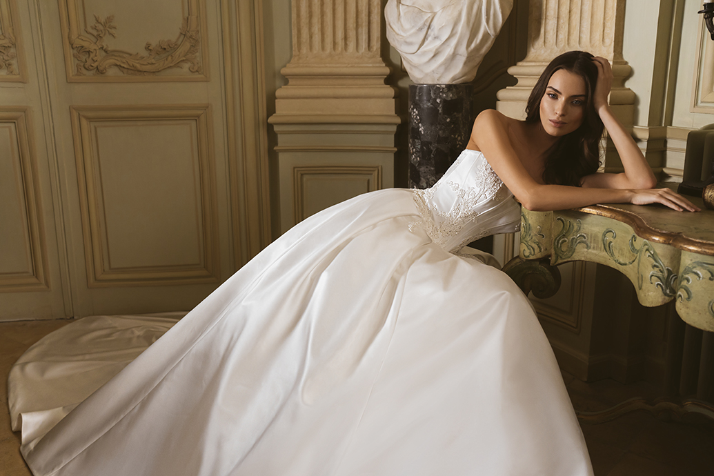 FREYA ist ein königliches Ballkleid aus Satin und Mikado – wie für eine Prinzessin gemacht. Der Herzausschnitt betont das Dekolleté, während versteckte Taschen dem Design einen modernen, praktischen Twist verleihen. Die skulpturale Silhouette mit voluminöser Schleppe vereint Tradition und Moderne.