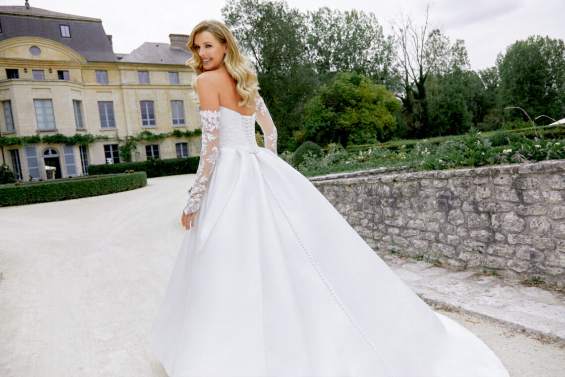 Mit Modell 44524 erreicht Eleganz ein neues Niveau – ein atemberaubendes Fit-and-Flare-Kleid aus weicher Chantilly-Spitze. Der eckige Ausschnitt und die langen Puffärmel formen eine zeitlose Silhouette, während dezente Pailletten dem mehrlagigen Spitzen- und Tüllstoff einen sanften Schimmer verleihen. Das taillierte Oberteil mit Jersey-Futter bietet Komfort und Halt, schmiegt sich sanft an die Figur und fließt in eine anmutige Schleppe über.