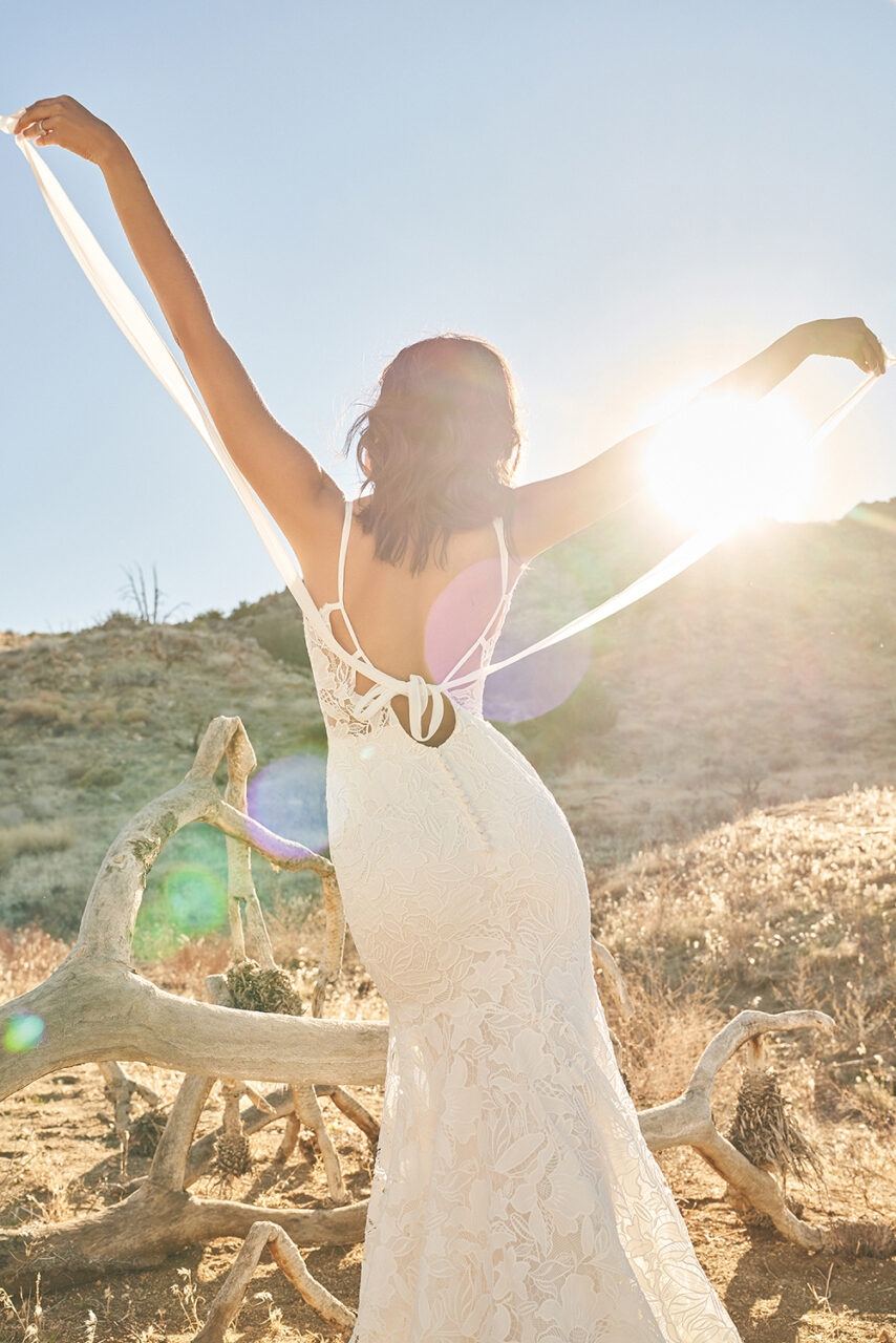 Das erste Kleid, das mir bei diesem Trend in den Sinn kommt, ist Style 66254, ein Kleid mit V-Ausschnitt, mit einem Oberteil, das mit Bio-Baumwollspitze verziert ist, und einem luftigen A-Linien-Chiffonrock. Die komplizierten Muster des Oberteils zusammen mit dem frei fließenden, schwerelosen Rock machen das perfekte Kleid sowohl für den „Soft and Dreamy“-Trend als auch für das, was man zeigen würde, um die Frühjahr/Sommer-Kollektion 23 von Lillian West zu beschreiben.