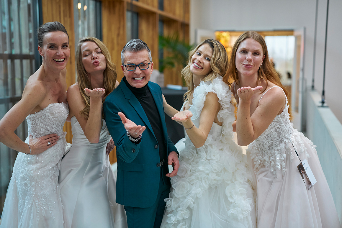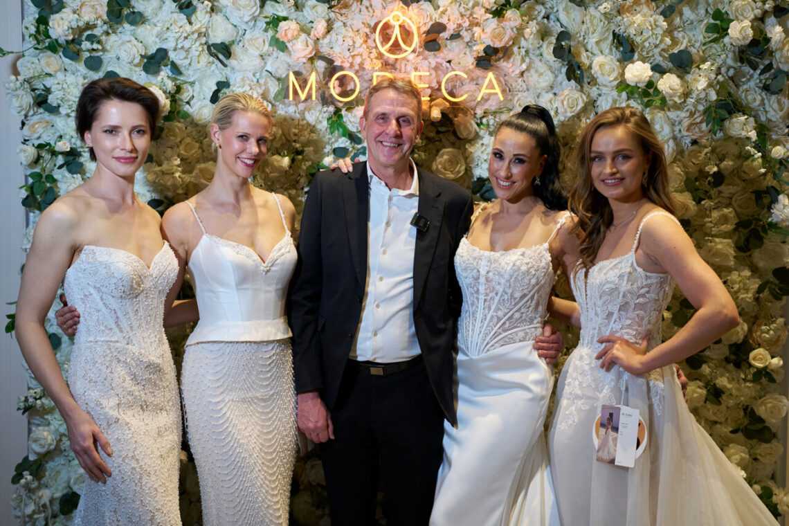 Foto: Dick van Zutphen, Inhaber und Geschäftsführer von Modeca Bridal, mit Models, die die neue Kollektion präsentieren.