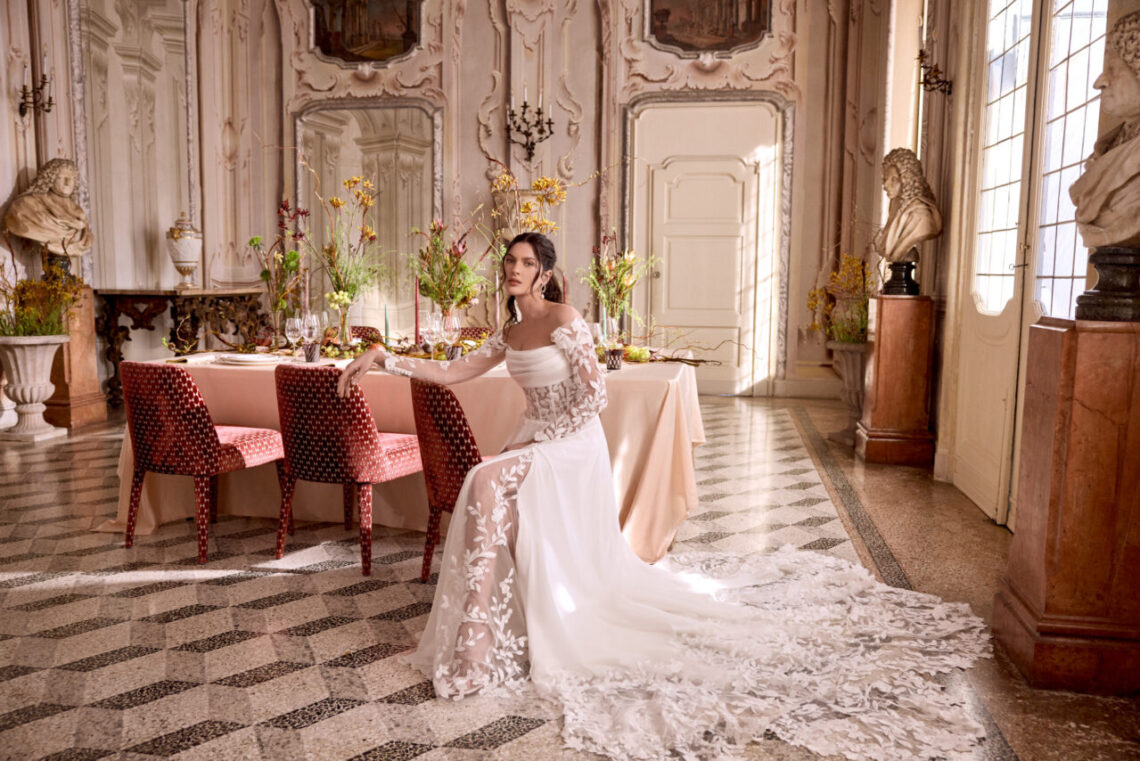Entworfen für selbstbewusste Bräute, die Anmut und Mut gleichermaßen verkörpern, beeindruckt die Kollektion mit dramatischen Schleppen, die unvergessliche Momente schaffen. Tonale Perlenstickereien, glamouröser Schimmer und edle Perlenakzente verleihen den eleganten, minimalistischen Silhouetten einen strahlenden Touch, oft ergänzt durch opulente Rücken-Details.