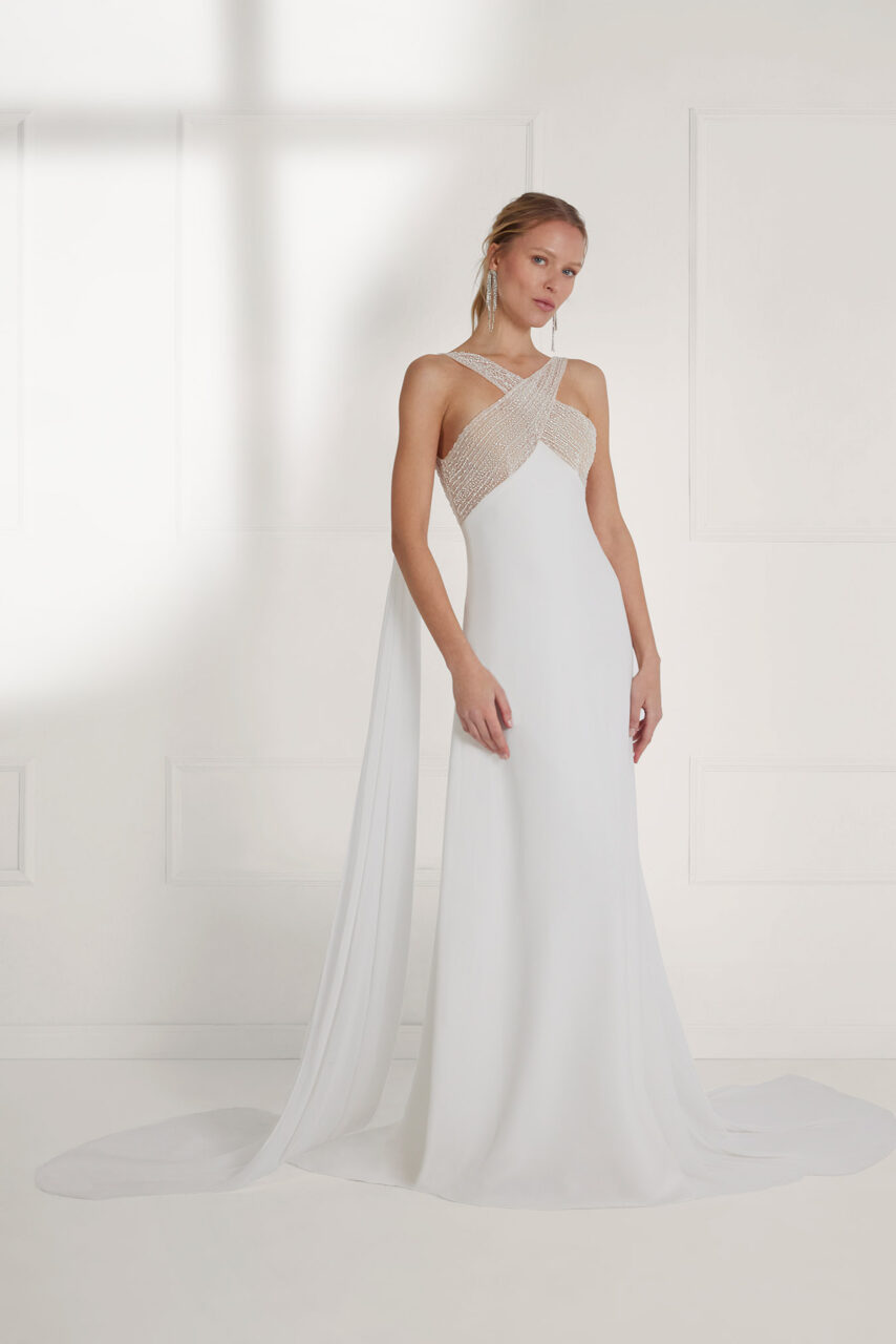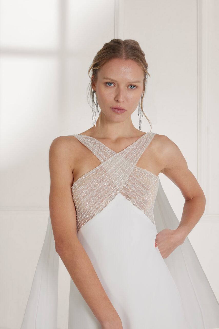 Und wir haben auch „CELINE”, eine Art Schwester von unsere „LEILA” Kleid, und das Kleid war das erste Kleid, das auf der Barcelona Bridal Week den Laufsteg eröffnete. Das Kleid verfügt über den charakteristischen Neckholder, aber mit einer völlig anderen Form des Rocks, des Materials und der Rückenverzierung.