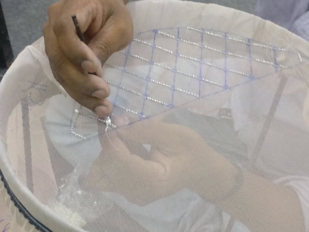 Yes, people often think the beading is a fabric which is cut off a roll but each pattern piece is hand beaded to size for each gown. The fabric is stretched over a frame and the pattern beaded on by hand taking up to 40 hours for every pattern piece. Motee is actually Hindi for Pearl and each gown is crafted by a very skilled team or Artisans.
