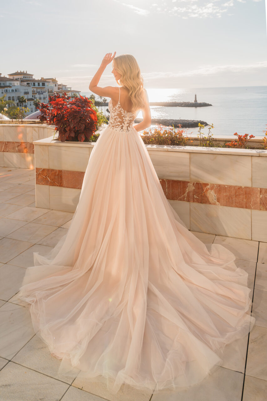 Soft, ethereal, and utterly romantic, this gown from NOVABELLA features delicate lace appliqués on a sheer structured bodice with dainty beaded straps and a subtle plunge.