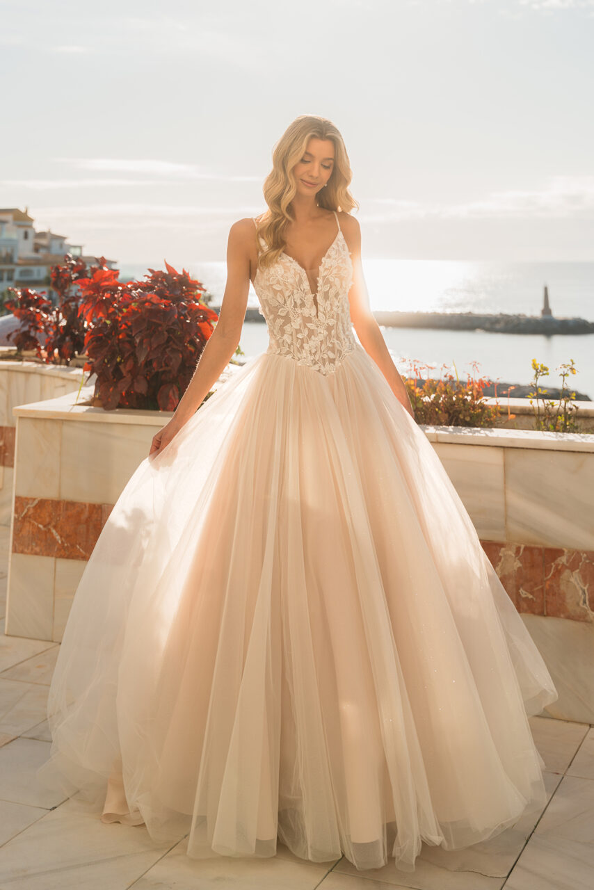 The flowing skirt catches the light with hints of sparkle, offering a magical, enchanting look with every step down the aisle.