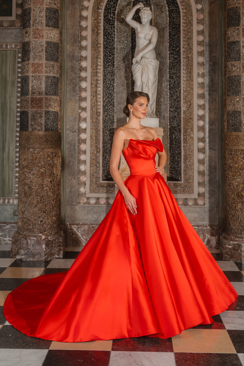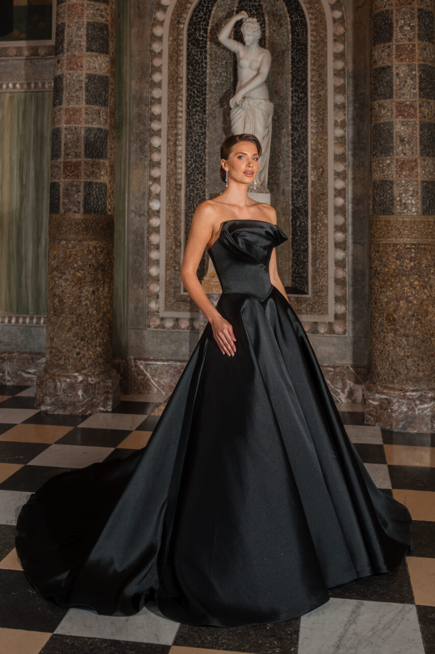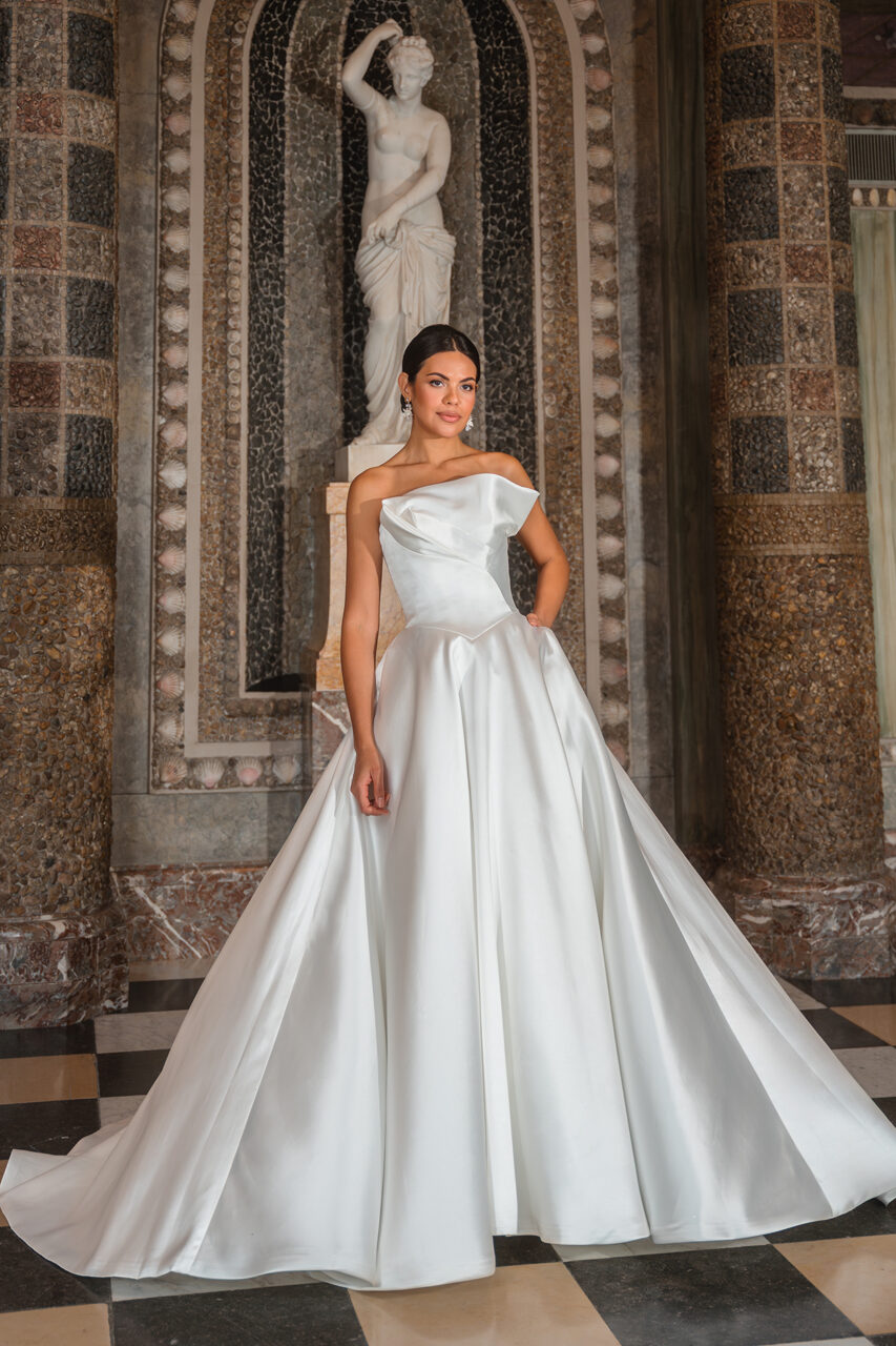 Sleek sophistication continues to dominate bridal trends and this contemporary ballgown from the DE LUXE Collection exemplifies it perfectly. The sculptural fold neckline adds architectural flair, perfectly balanced by the clean lines of the full A-line skirt. With hidden pockets and a structured bodice, this gown is made for the bride who embraces tradition with a fashion-forward vision.