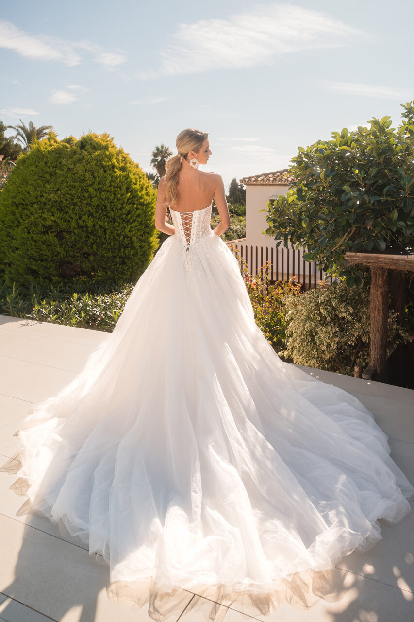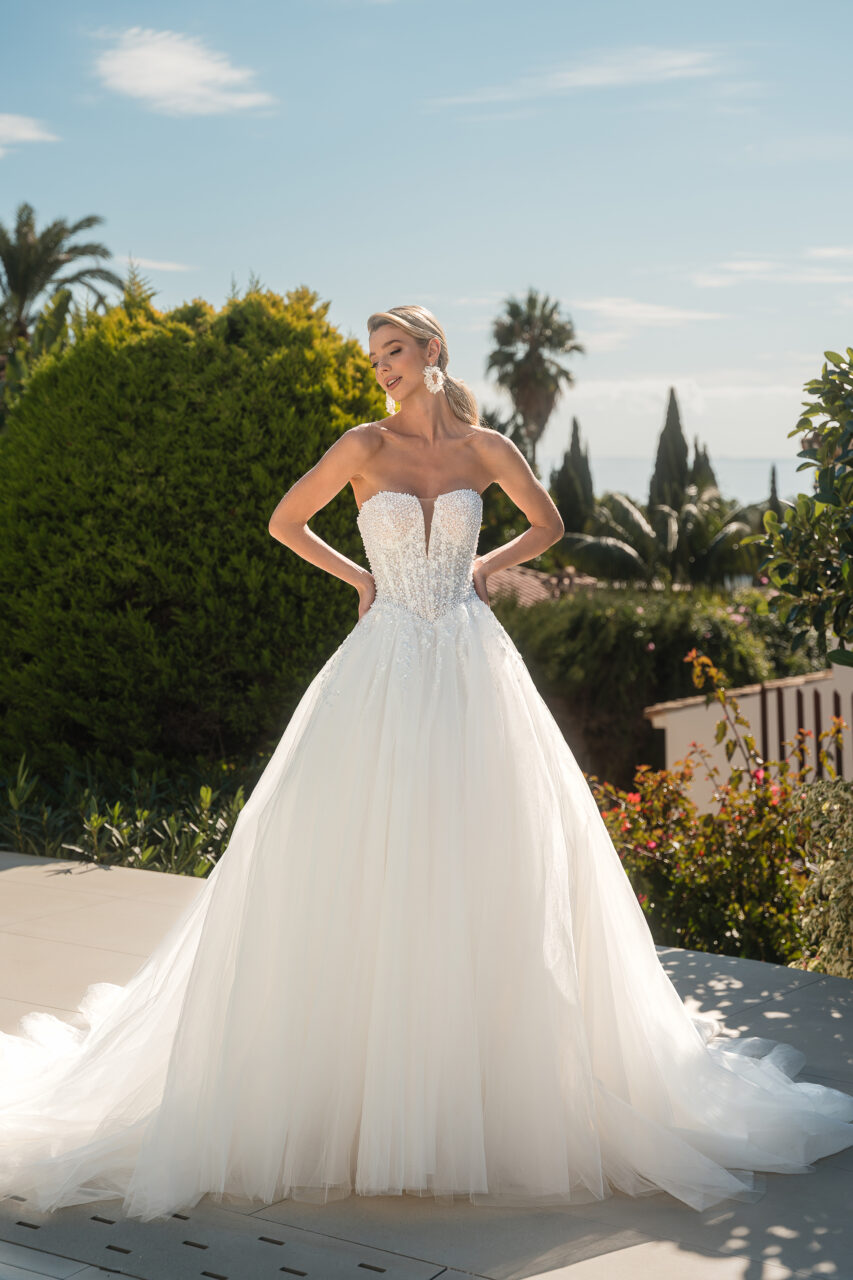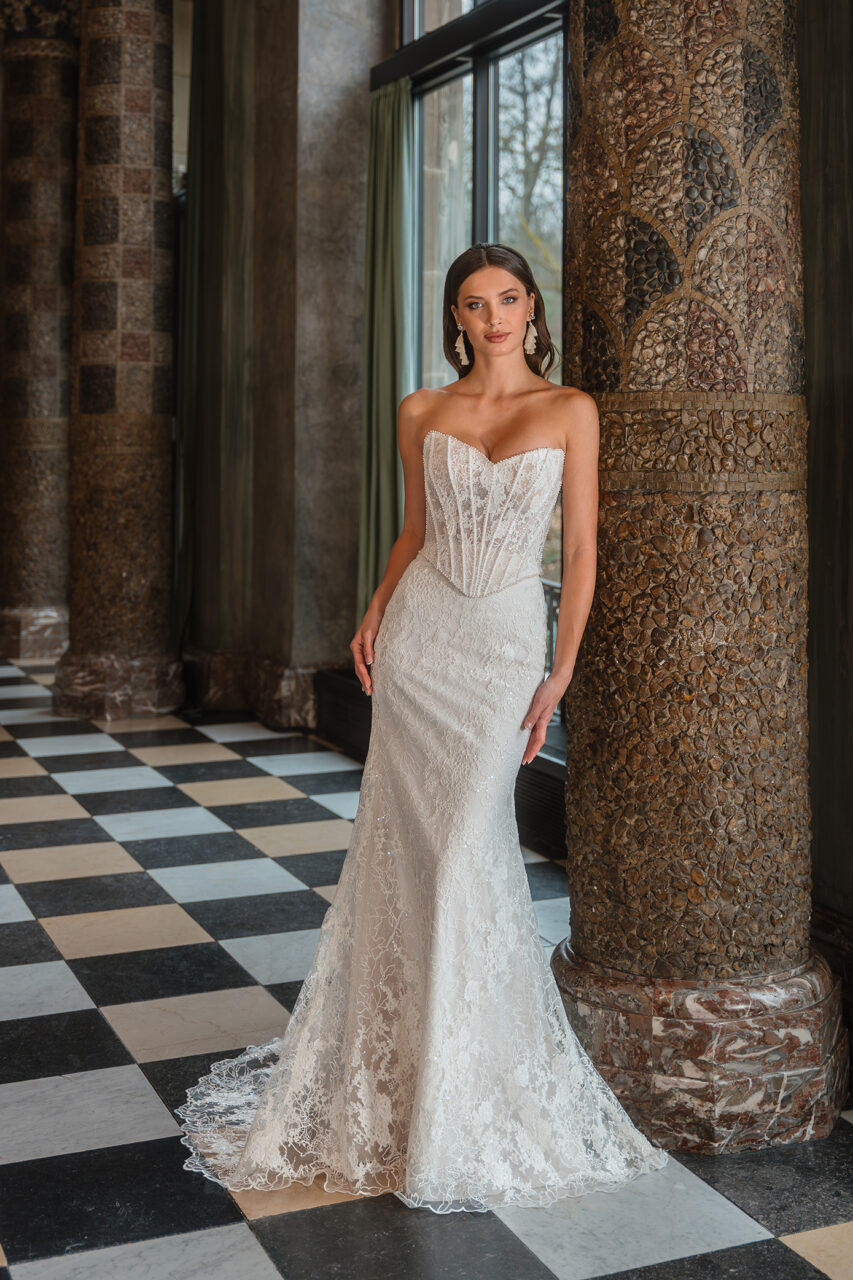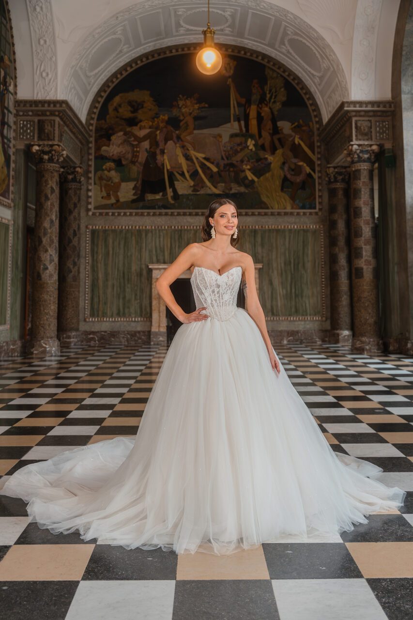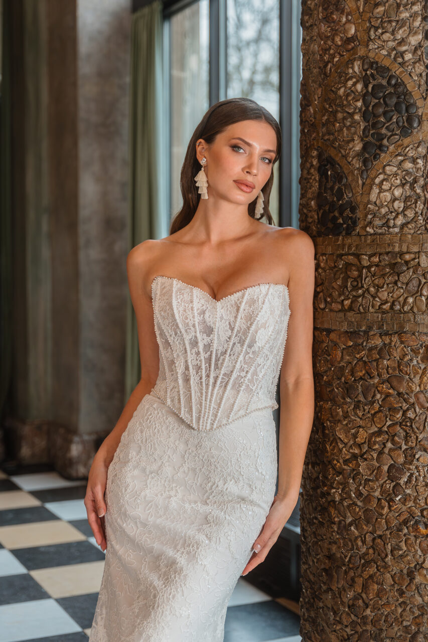A lace-up corset back adds structure and a touch of vintage allure, making it the perfect choice for brides seeking classic glamour with a modern twist.