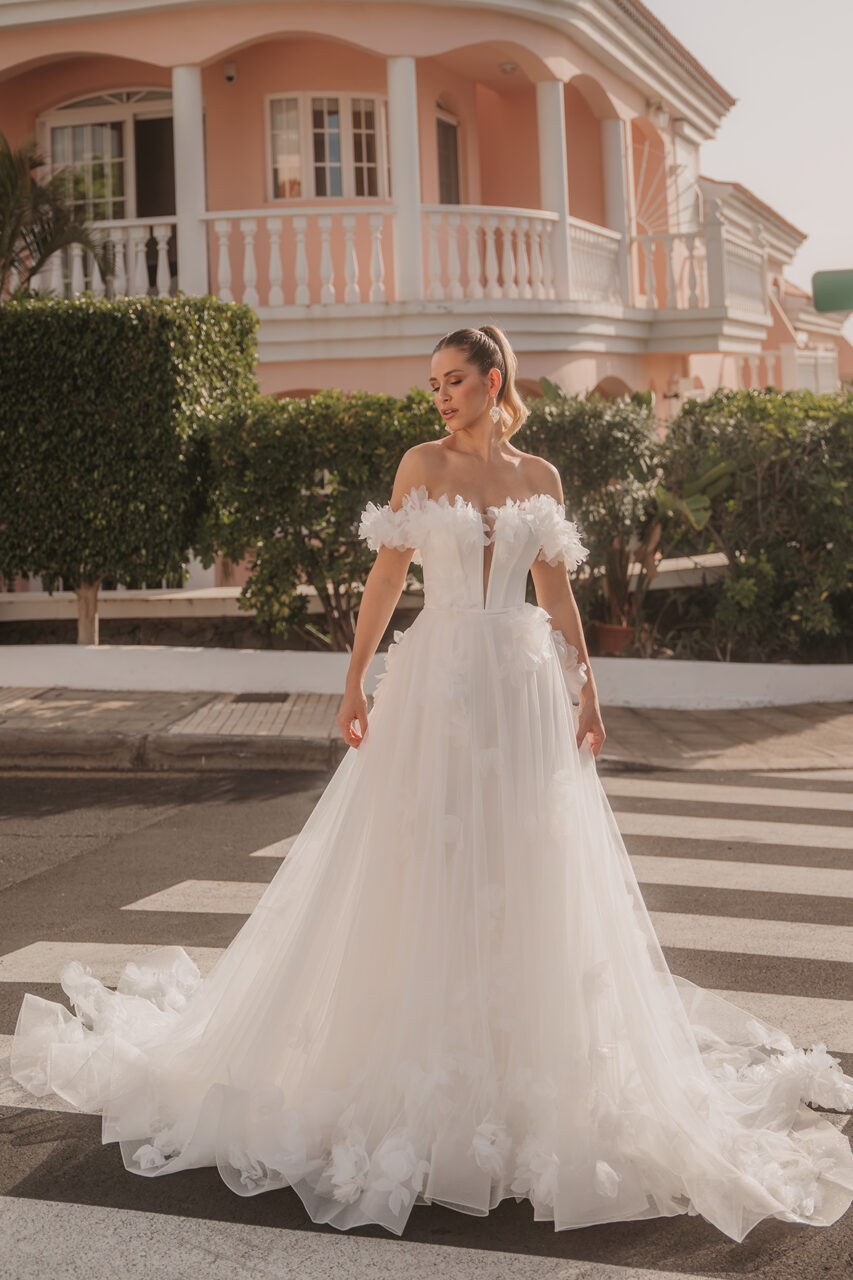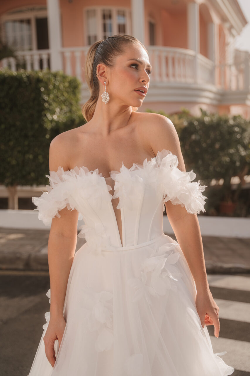 Whimsical romance comes to mind with this stand-out style from the DREAMY Collection. A vision of delicate enchantment, this off-the-shoulder gown is adorned with soft, dimensional floral embellishments on a structured bodice that cascade onto a soft, flowing skirt.