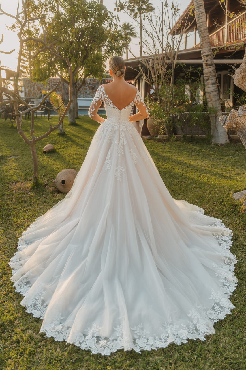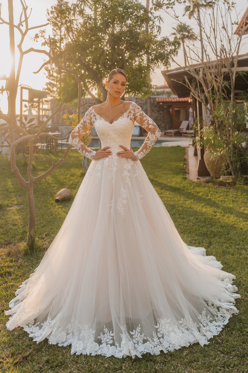 For brides who love long sleeves, this style from LISA DONETTI is a timeless beauty that exudes grace and grandeur. The illusion sleeves feature floral appliqués while the bodice creates a refined yet alluring silhouette.