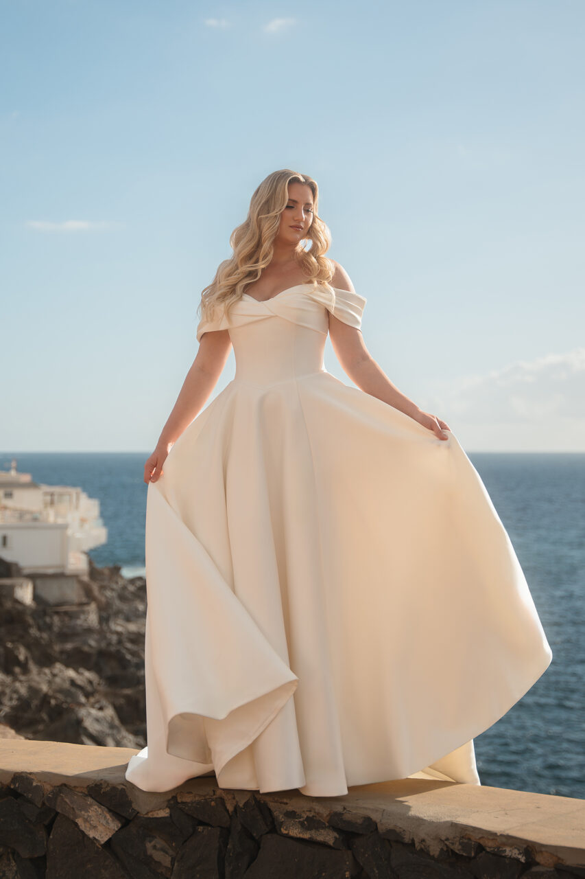 This clean-chic gown is another minimalistic favorite from the curvy MADONNA collection with it’s off-shoulder softly draped neckline, flattering the décolletage. The structured bodice and lace up back defines the waist before flowing into a clean voluminous skirt.
