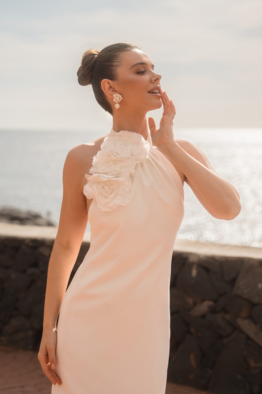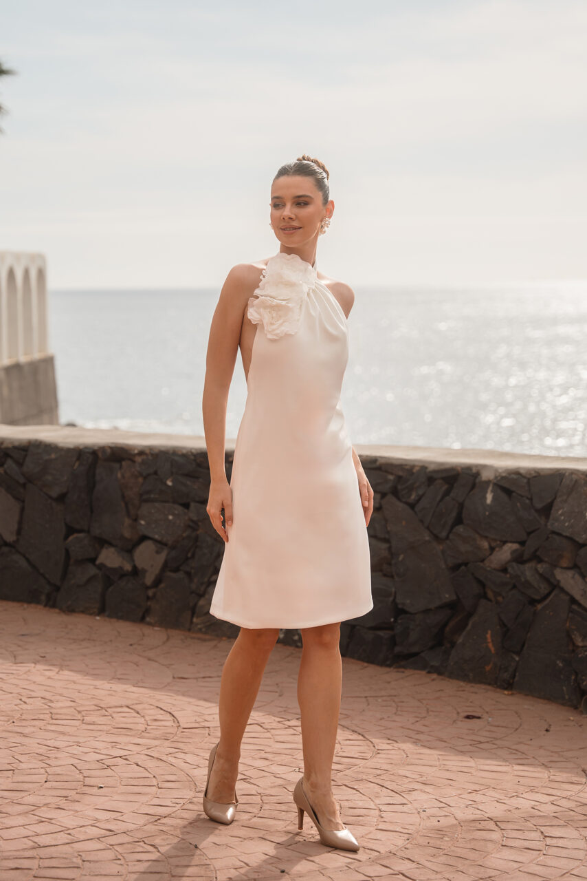 This halter mini dress exudes understated elegance with a clean silhouette elevated by floral statements at the neckline, adding just the right touch of softness and romance. With its minimalist cut and fashion-forward flair, this dress makes a subtle yet unforgettable statement.