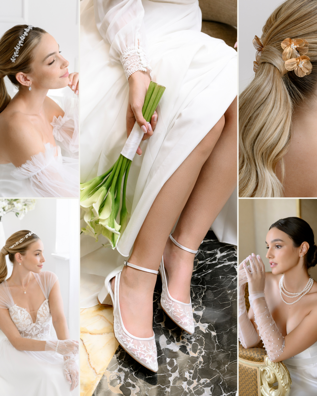 Bridal shoes remain a signature category for the brand, combining handcrafted details with exceptional comfort. This season also highlights pearl chokers, statement earrings, hair accessories with floral accents and elegant bridal gloves, which have already received a very positive response.