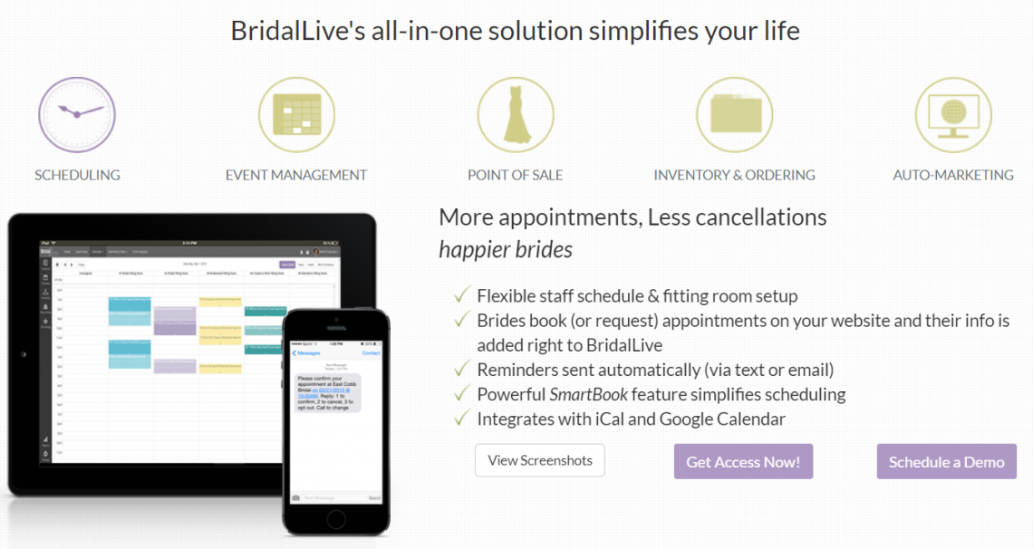 BridalLive is an “all-in-one” retail management system. This means that you don’t have to jump from system to system to run your shop. All of your CRM, Appointment, Inventory, Point of Sale, Purchasing and Report data is all just a click away. By bringing everything together in 1 system, you are able to get actionable business metrics like “Closing Ratio” at the click of a button.