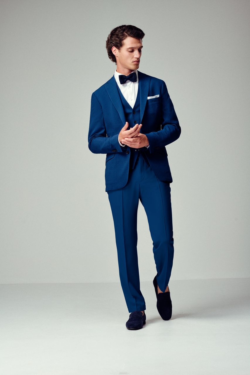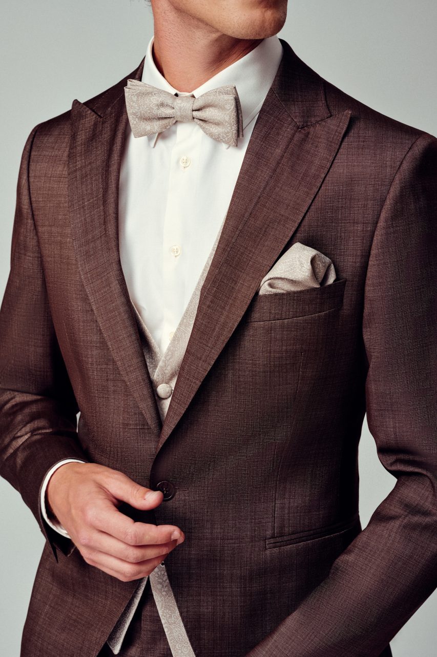 The trend topic is the “Seersucker Suit” in fashionable colors. The sporty suit has an irregular surface texture and stands for maximum comfort. The suit is available in the colors olive, old rose and denim blue. Our wool-silk suits with a subtle luster in a large selection of colors and with coordinated silk vests and festive accessories are an elegant alternative.