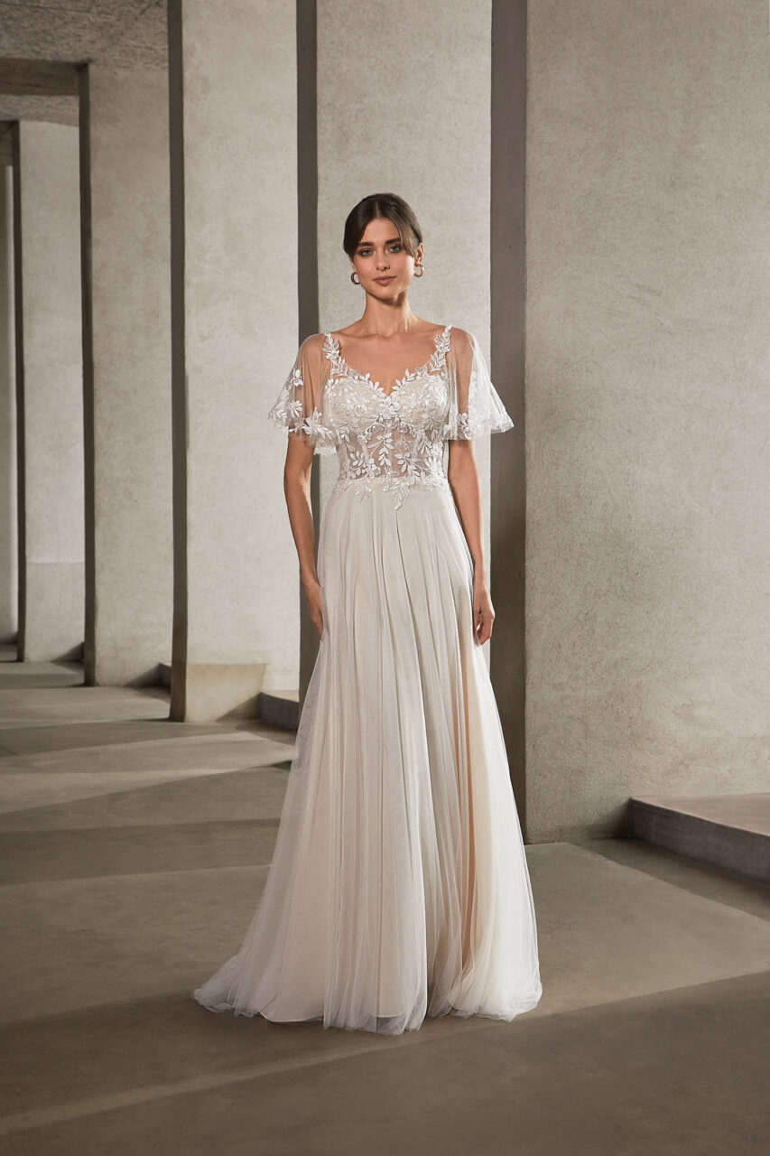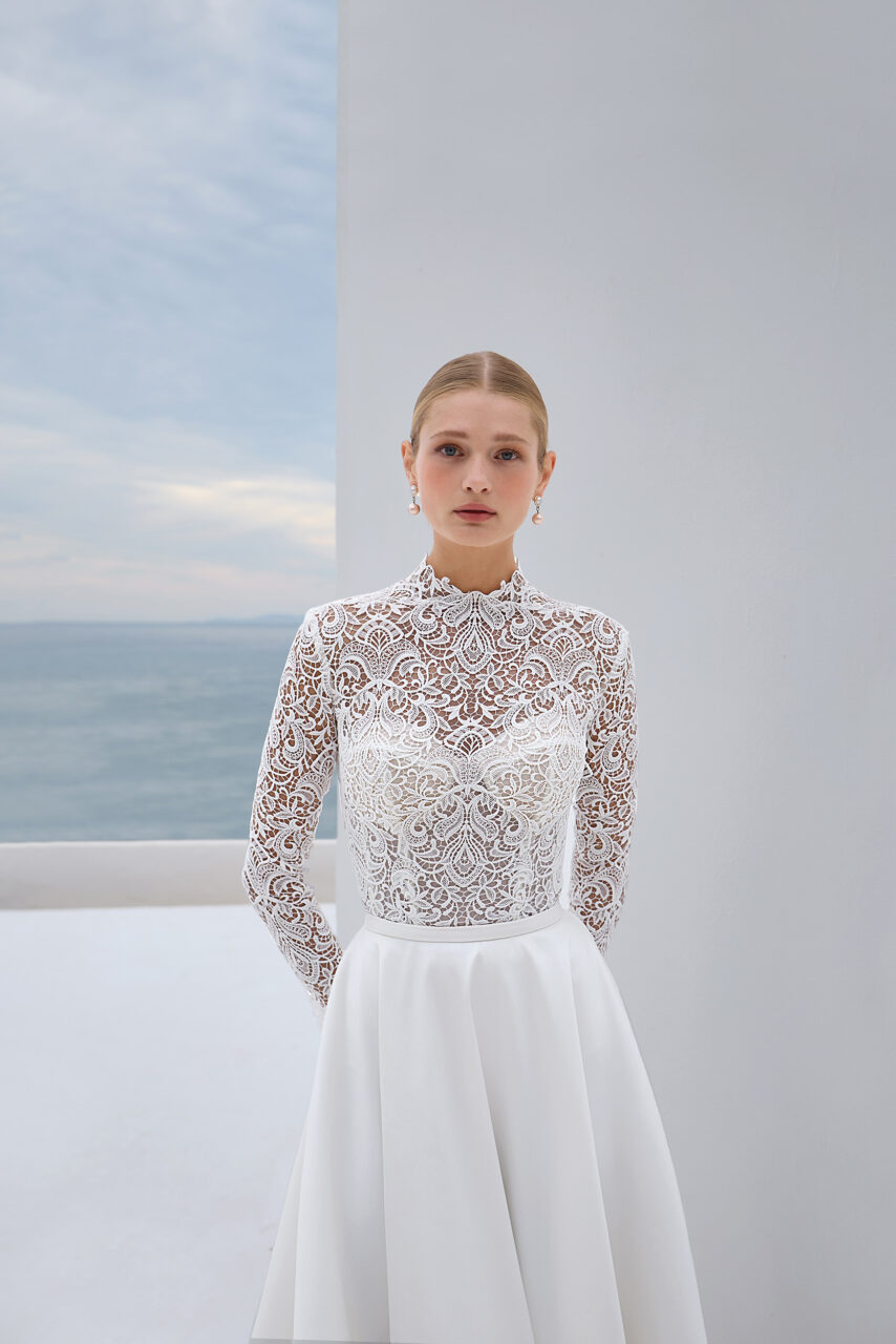 Spectacular lace embroideries, shimmering beadwork, captivating neckline variations, and dazzling coordinating pearl embellishments embody the pinnacle of bridal luxury while the playful neckline combinations bring a modern twist to traditional bridal fashion.