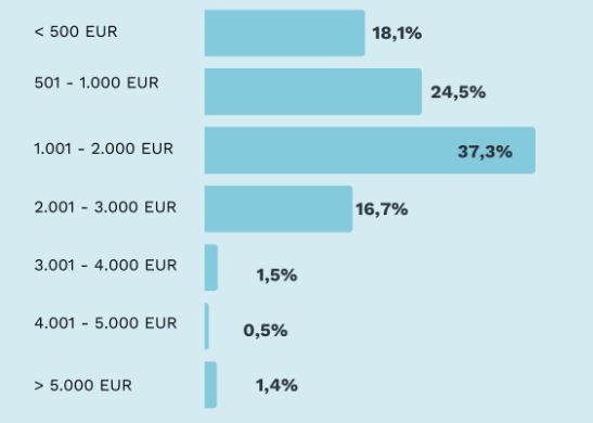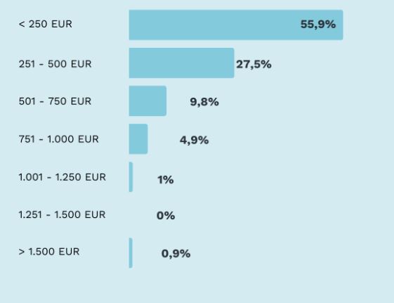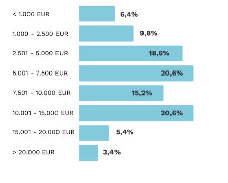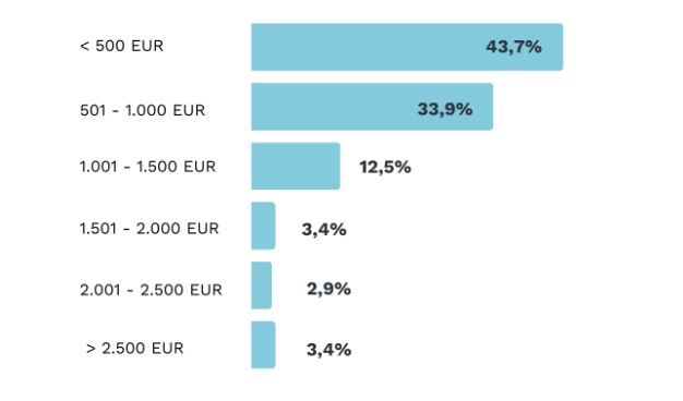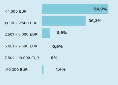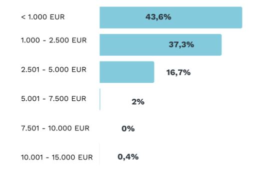 Here too, a large number of couples, 43.6 percent, settle for a photographer or videographer whose services cost under 1,000.00 euros. However, many other jubilant couples spend a bit more money for the best photos and videos of the wedding.