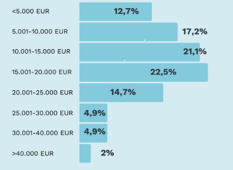Most couples, namely 22.5 percent, fall within this price range. Only about one in eight couples is frugal with their wedding expenses, spending less than 5,000.00 euros. And only one in 50 couples splurges, spending more than 40,000 euros on their wedding.