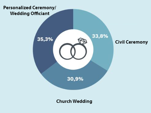 The number of couples who marry solely with the obligatory ceremony at the city registry office accounts for about a third, as does the number of couples who marry in a church or with an additional personalized ceremony.