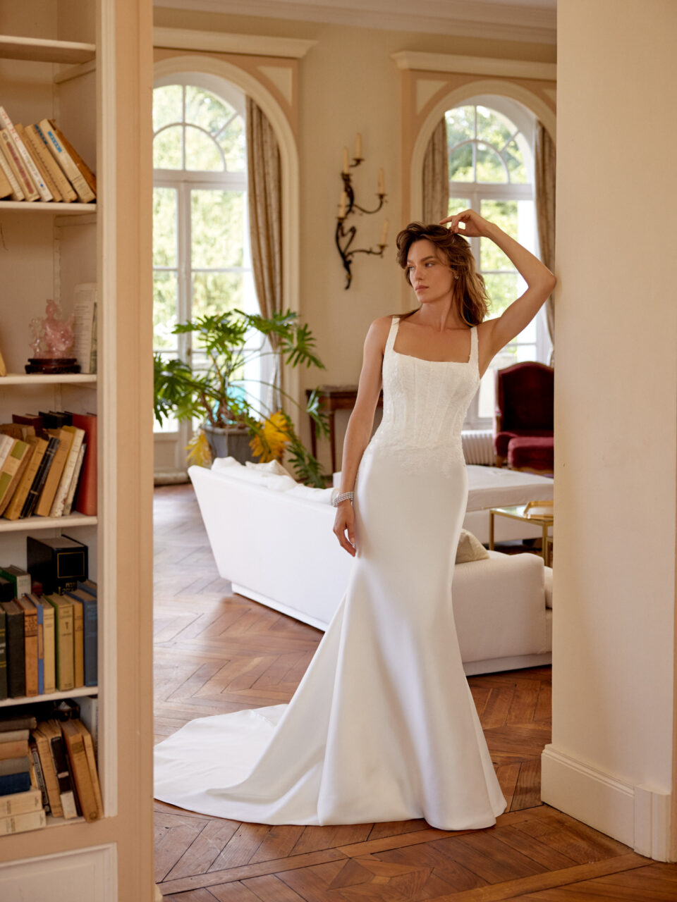 This sleek and sophisticated stretch Mikado fit-and-flare gown features a square front neckline and a V-back. The bodice is adorned with matte corded lace appliqués and exposed boning, with lace motifs cascading onto the basque waistline. The look is finished with buttons extending to the end of the chapel-length train.