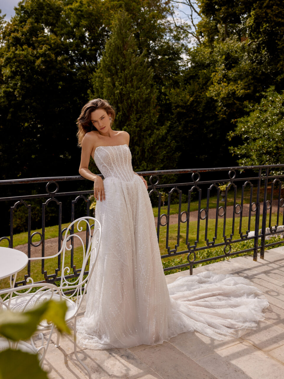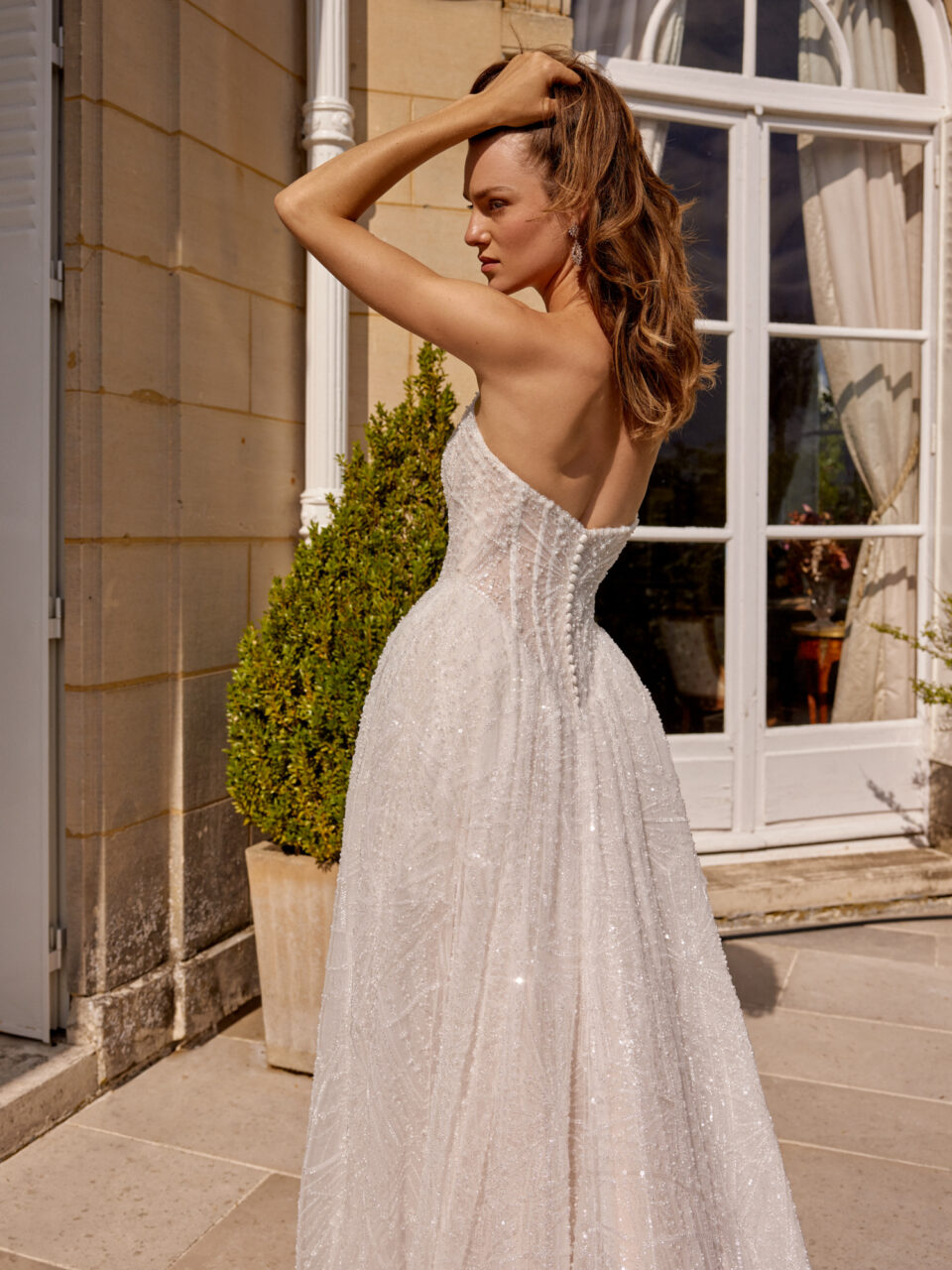Merida is a sight to behold, featuring an all-over matte Alençon corded lace slim A-line silhouette with a strapless sweetheart neckline, finished with delicate eyelash lace trim. The gown is completed with buttons extending down the chapel-length train and a scalloped lace hem.