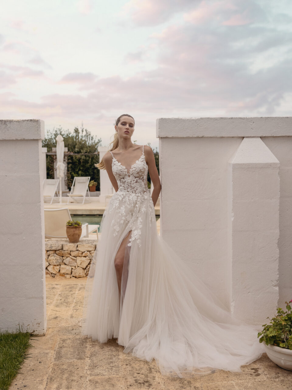 Summer weddings call for dresses that exude comfort and grace while keeping the bride cool under the sun. A-line silhouettes with breathable fabrics like tulle, crepe or lightweight chiffon are ideal choices. Wedding dress Amir and Baloe are stunning airy dresses that suit the summer time perfectly.