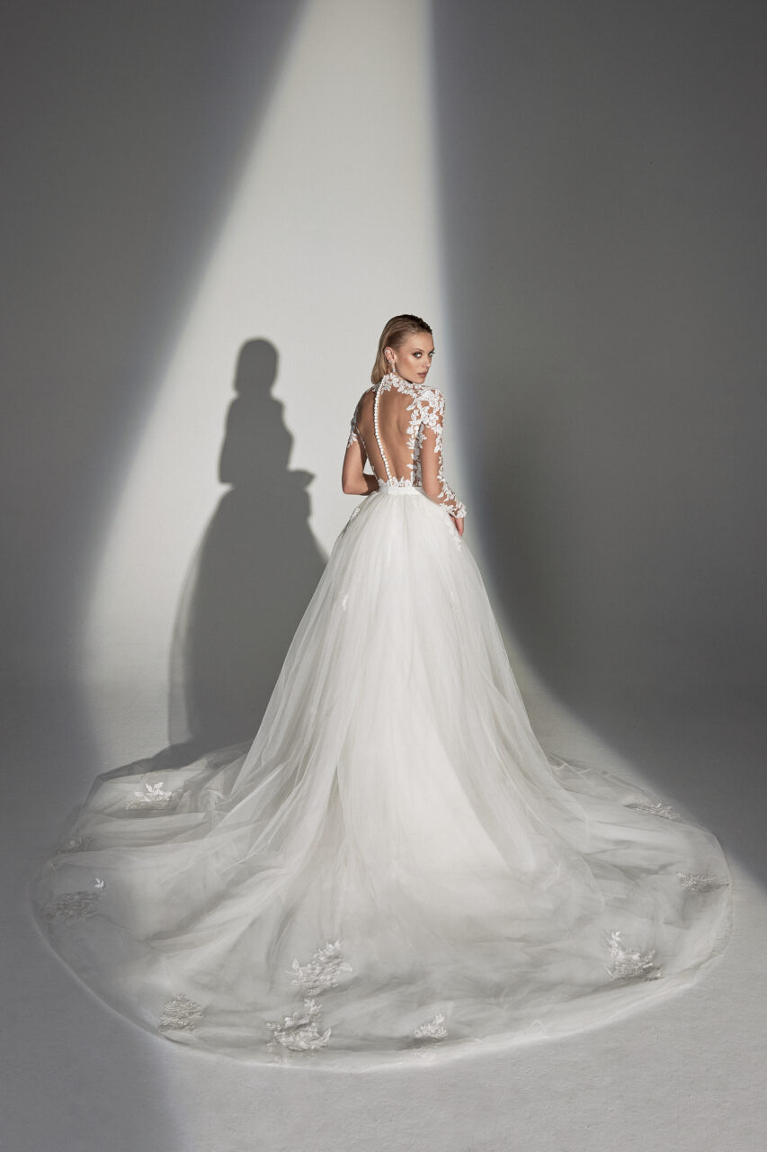 This fashion-forward fit and flare wedding gown is all about the romance. Done with an illusion high neckline, the style is elevated with long sleeves and an illusion back. A blend of matte and sequined cotton lace appliqués adorn the bodice and trickle down the hips creating a figure-defining shape. The appliqués continue along the hem around to the back to finish off the sweep length train. The dress is paired with the Juliet Skirt, sold separately, for a dreamy look that allows brides to instantly transform their style from the day into the night.