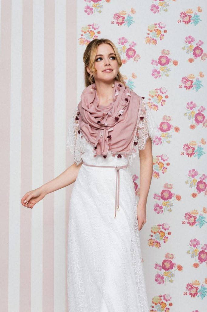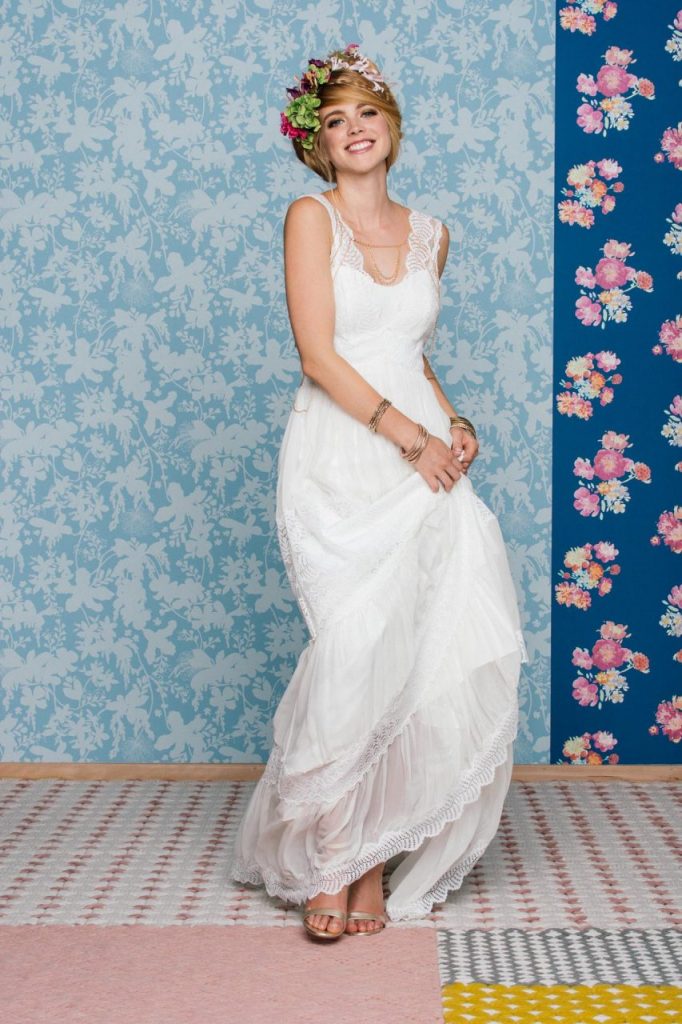 Paired with flowing silk skirts, they radiate 20’s flair in feathery, loose silhouettes, conjuring up casual, 70’s hippie wedding dresses. A highlight of the new collection are the airy Ibiza wedding dresses, with delicate spaghetti straps or hand-crocheted halternecks, which lend a relaxed but chic, beach-holiday vibe to any ceremony. Golden body chains and big, cotton boho shawls are combined with the dresses instead of boleros.