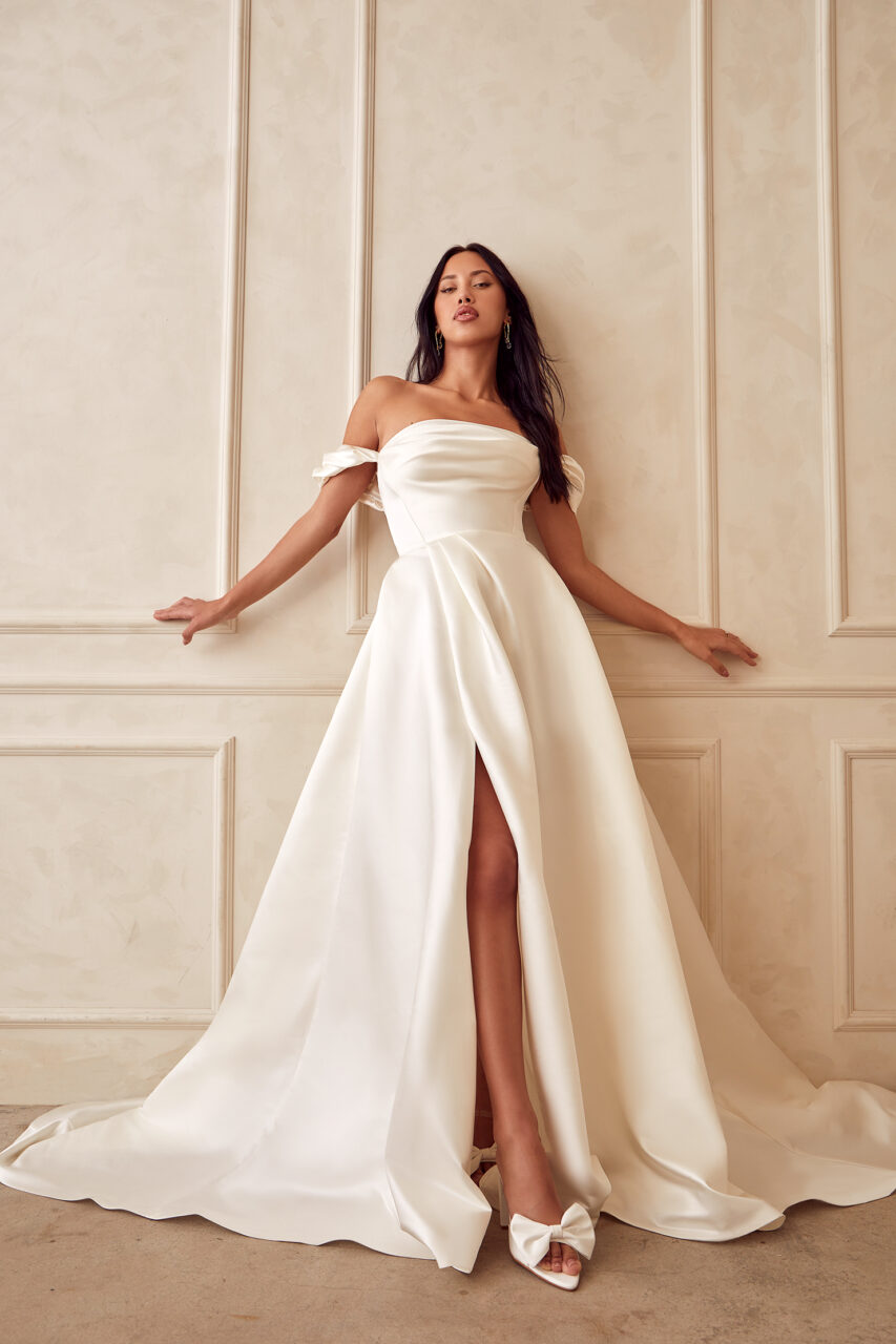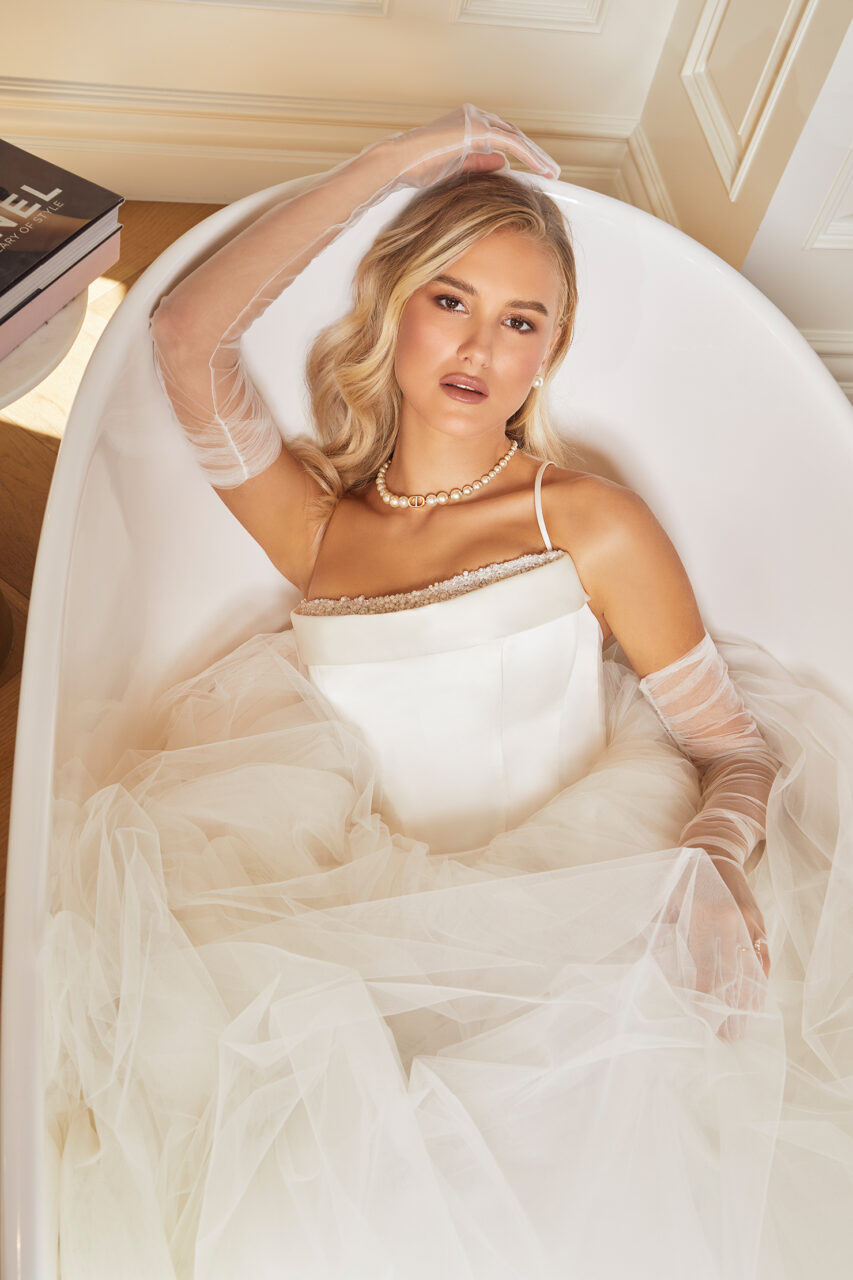 Drawing inspiration from the captivating charm of Old Hollywood glam and infused with iconic 90’s fashion elements—think square and scooped necklines, dramatic drop or Basque waistlines, and the structured sophistication of corset boning styles, including exposed boning, pointed, and illusion necklines.