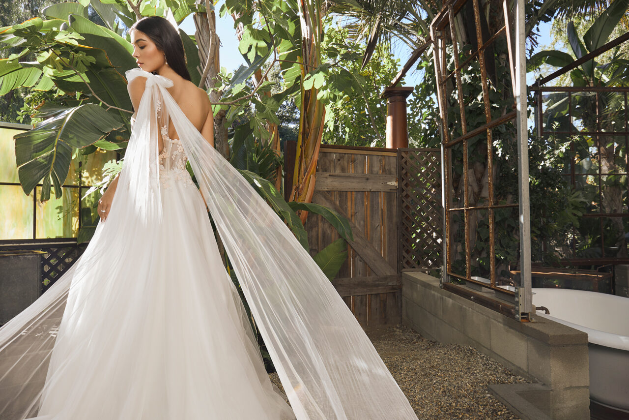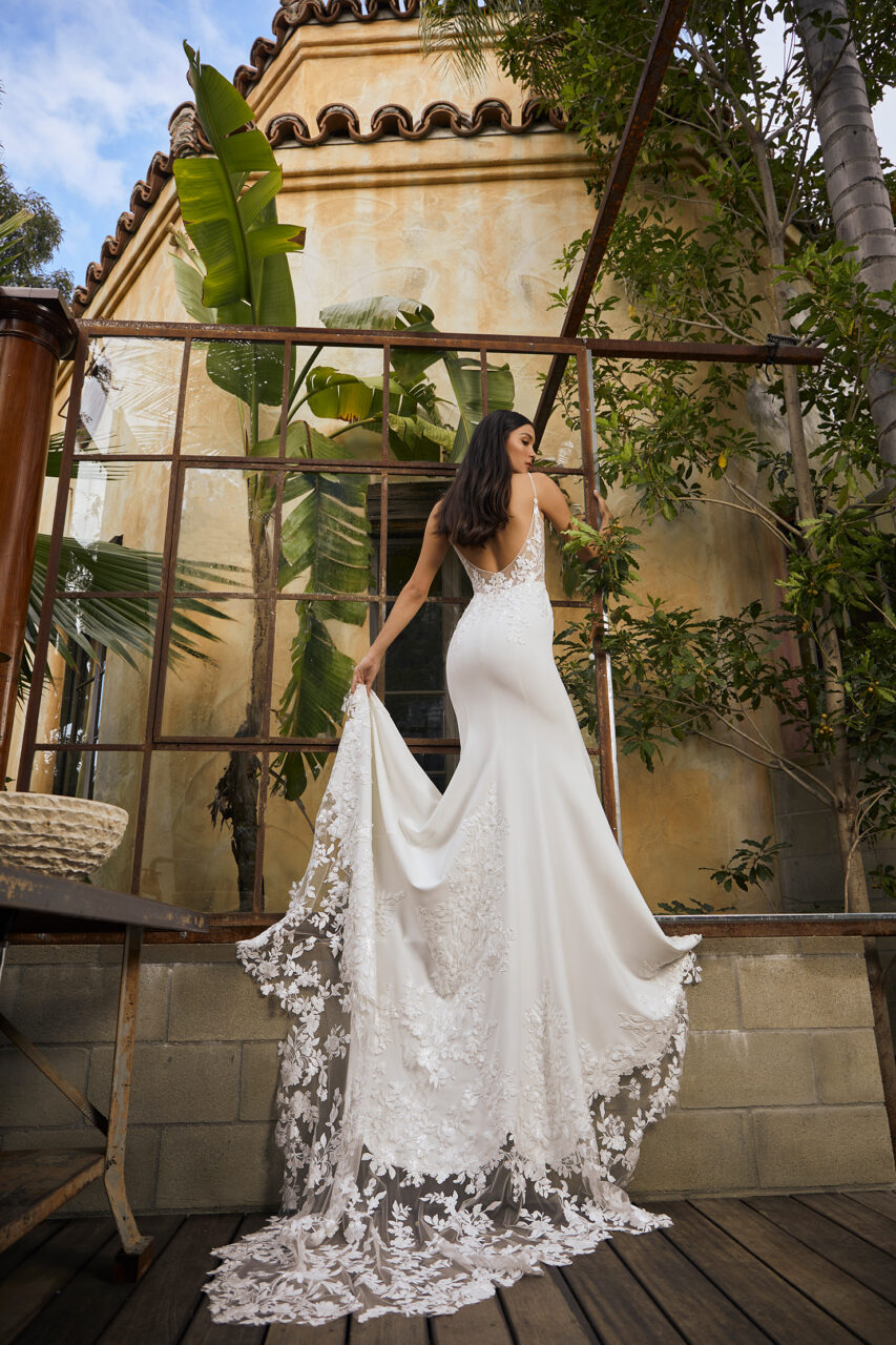 Each piece is uniquely infused with dreamy elements featuring detachable accessories, corsets, exposed boning, and sculpting lace details with intricately layered textures. This collection showcases a diverse range of laces combined with soft fabrics, subtle pastel hues, and a variety of necklines including illusion, plunging, and halter. “Mountain Oasis” is picturesque and simply serene, designed with the free-spirited bride in mind.