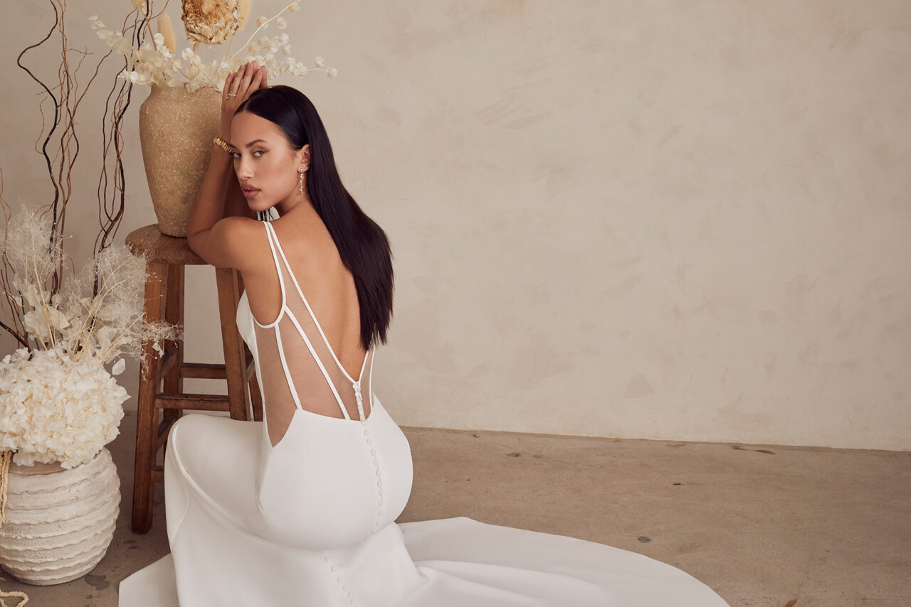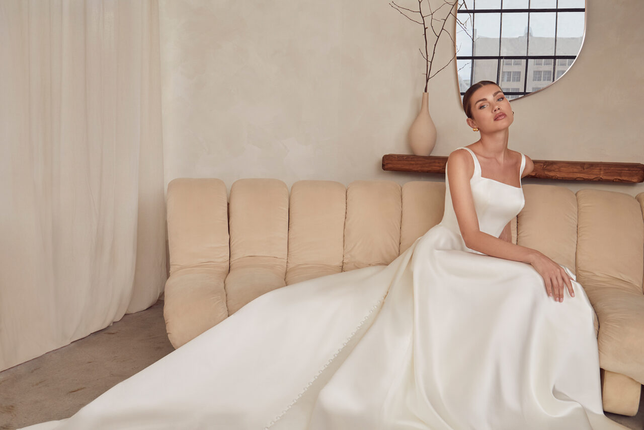 Delicate pin-thin straps frame bodices, and striking asymmetrical elements culminate in cowl details and low back designs. The meticulous construction and satin selection speak to a timeless appeal in each dress. “Sculpted Elegance” was created for the modern bride.